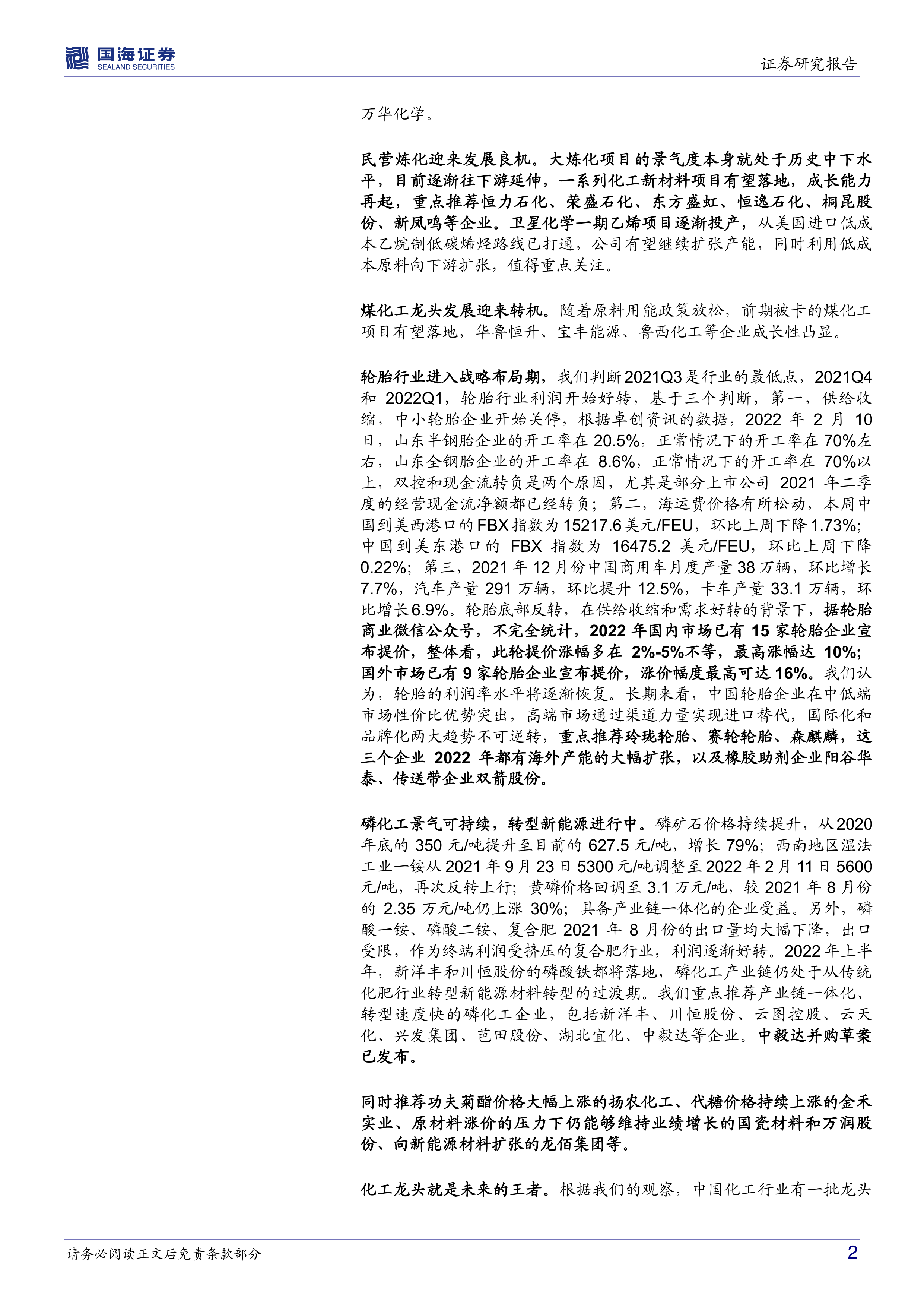 煤化工龙头发展迎来转机。随着原料用能政策放松,前期被卡的煤化工项目有望落地,华鲁恒升、宝丰能源、鲁西化工等企业成长性凸显。轮胎行业进入战略布局期,我们判断 2021Q3 是行业的最低点,2021Q4和 2022Q1,轮胎行业利润开始好转,基于三个判断,第一,供给收缩,中小轮胎企业开始关停,根据卓创资讯的数据,2022 年 2 月 10日,山东半钢胎企业的开工率在 20.5%,正常情况下的开工率在 70%左右,山东全钢胎企业的开工率在 8.6%,正常情况下的开工率在 70%以上,双控和现金流转负是两个原因,尤其是部分上市公司 2021 年二季度的经营现金流净额都已经转负;第二,海运费价格有所松动,本周中国到美西港口的 FBX 指数为 15217.6 美元/FEU,环比上周下降 1.73%;中国到美东港口的 FBX 指数为 16475.2 美元/FEU,环比上周下降0.22%;第三,2021 年 12 月份中国商用车月度产量 38 万辆,环比增长7.7%,汽车产量 291 万辆,环比提升 12.5%,卡车产量 33.1 万辆,环比增长 6.9%。轮胎底部反转,在供给收缩和需求好转的背景下,据轮胎商业微信公众号,不完全统计,2022 年国内市场已有 15 家轮胎企业宣布提价,整体看,此轮提价涨幅多在 2%-5%不等,最高涨幅达 10%;国外市场已有 9 家轮胎企业宣布提价,涨价幅度最高可达 16%。我们认为,轮胎的利润率水平将逐渐恢复。长期来看,中国轮胎企业在中低端市场性价比优势突出,高端市场通过渠道力量实现进口替代,国际化和品牌化两大趋势不可逆转,重点推荐玲珑轮胎、赛轮轮胎、森麒麟,这三个企业 2022 年都有海外产能的大幅扩张,以及橡胶助剂企业阳谷华泰、传送带企业双箭股份。