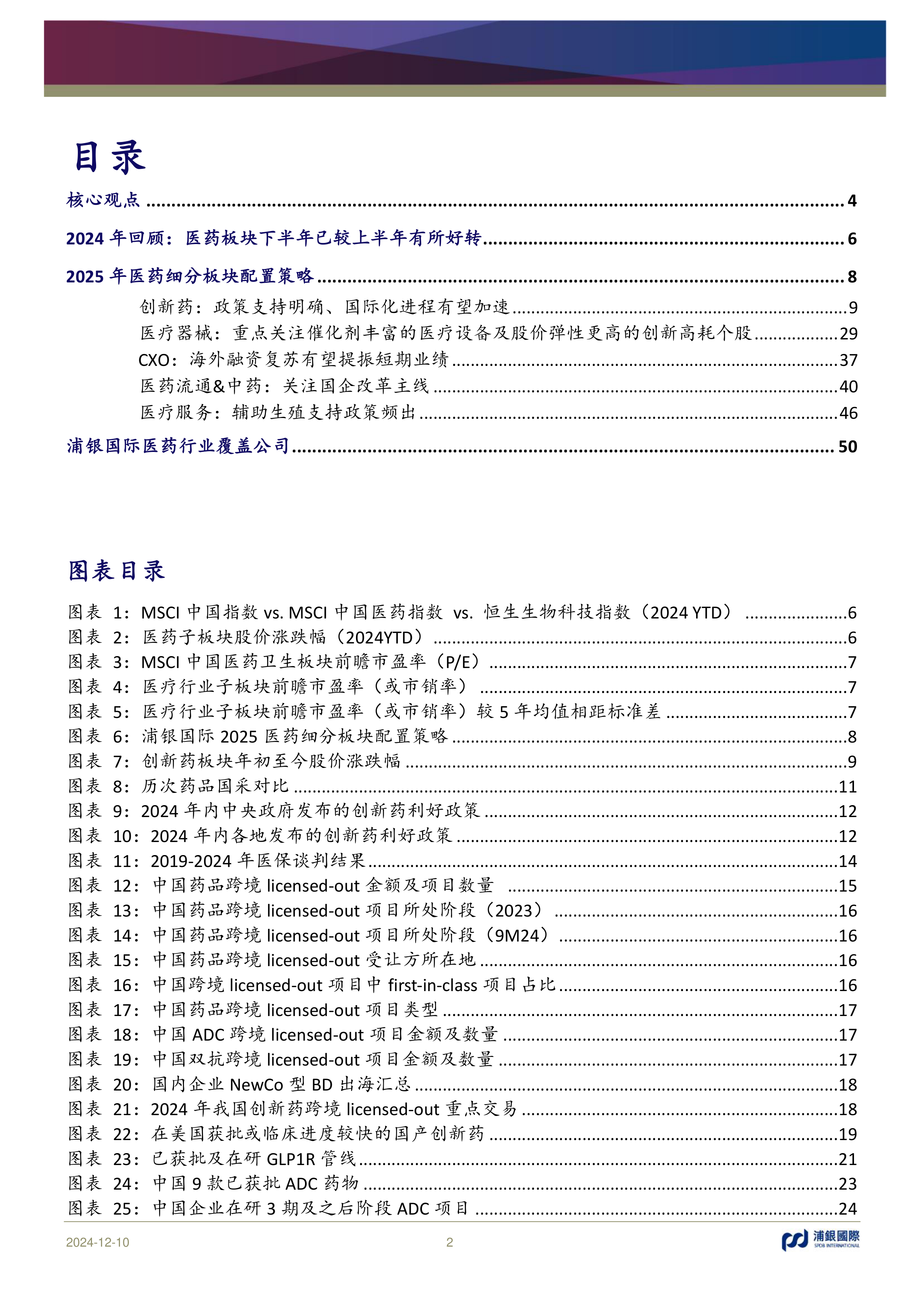 本报告基于浦银国际对2024年医药行业表现的回顾和对2025年市场趋势的预测,对医药行业各个细分板块的投资机会和风险进行了深入分析,并提出了具体的投资建议。报告强调,虽然2024年医药行业整体表现低迷,但下半年有所好转,且目前估值处于低位,2025年行业基本面有望进一步提升,板块情绪有望上涨。 报告建议投资者关注创新药、创新高值耗材以及CXO板块的投资机会,同时需关注潜在的风险因素。 报告还特别关注了国家政策对医药行业的影响,以及中国创新药出海的趋势,为投资者提供了全面的市场分析和投资参考。