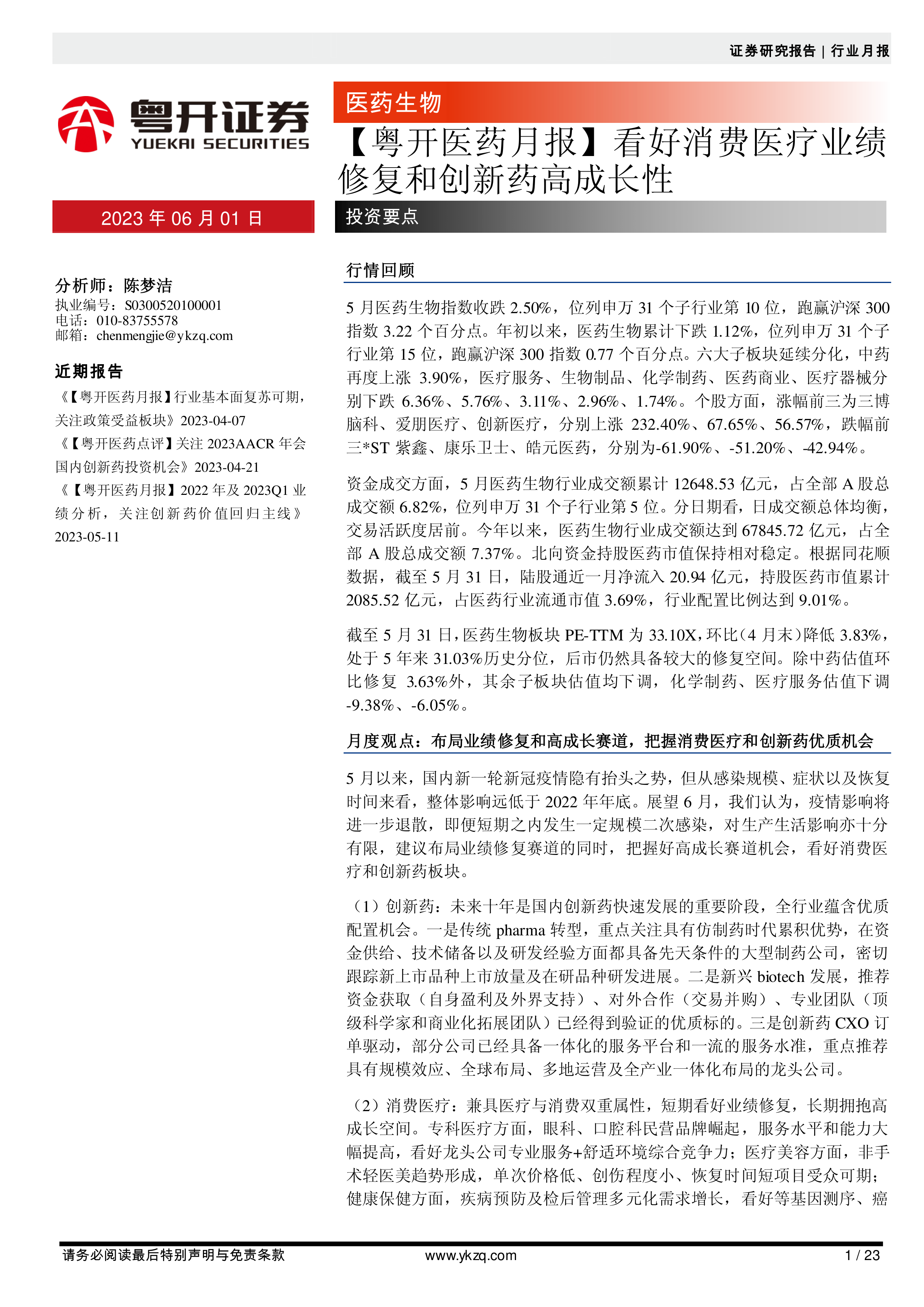 【粤开医药月报】看好消费医疗业绩修复和创新药高成长性