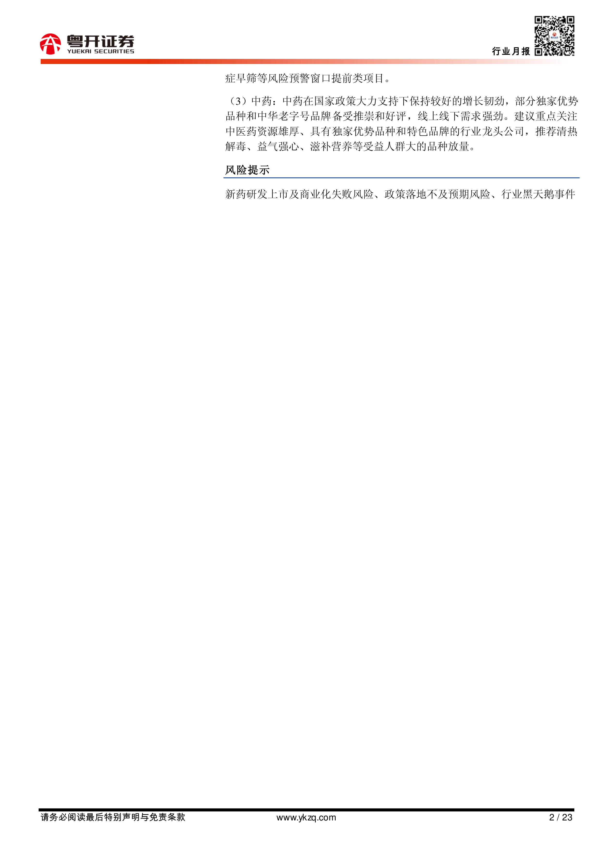 (3)中药:中药在国家政策大力支持下保持较好的增长韧劲,部分独家优势品种和中华老字号品牌备受推崇和好评,线上线下需求强劲。建议重点关注中医药资源雄厚、具有独家优势品种和特色品牌的行业龙头公司,推荐清热解毒、益气强心、滋补营养等受益人群大的品种放量。