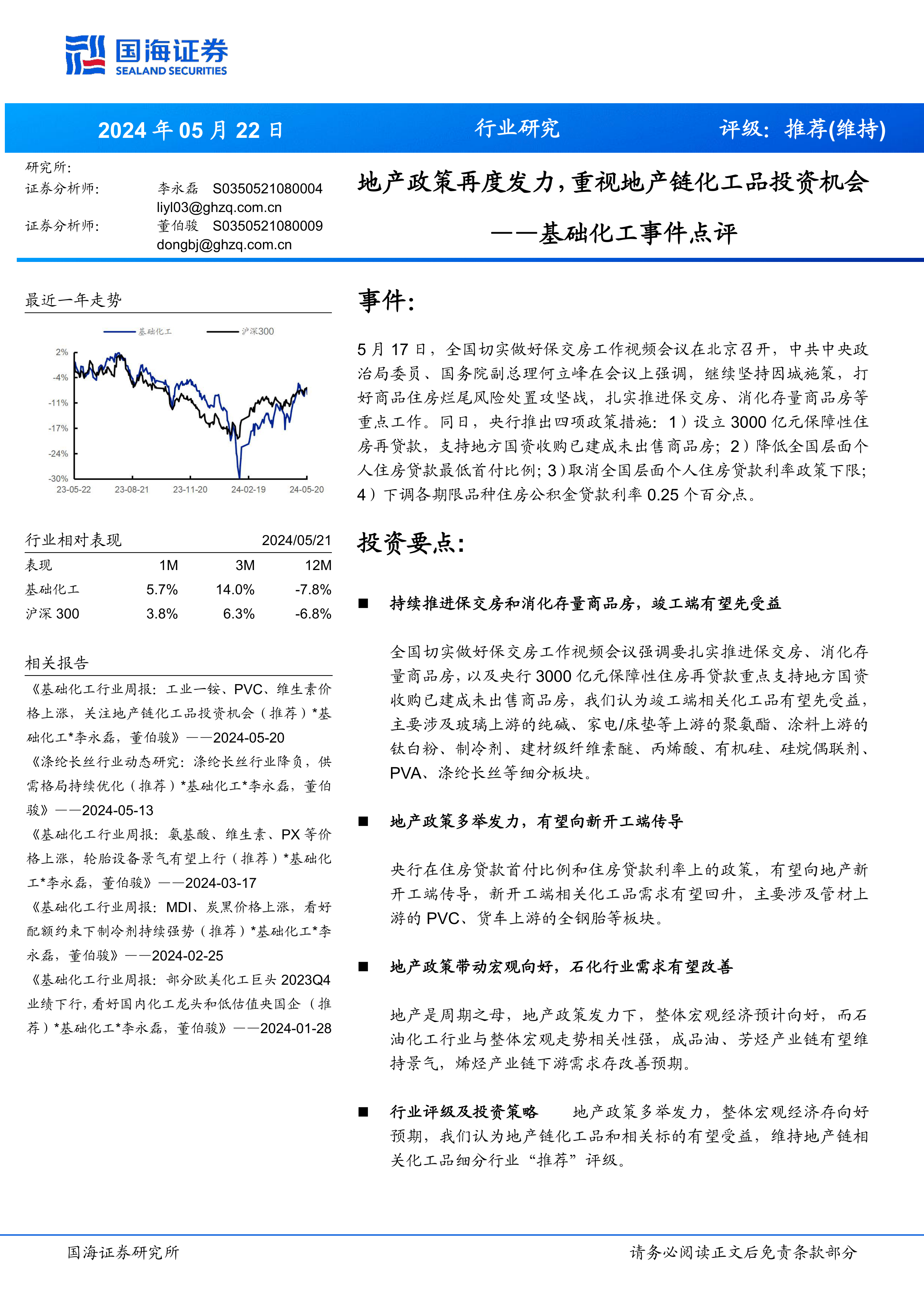 行业评级及投资策略地产政策多举发力,整体宏观经济存向好预期,我们认为地产链化工品和相关标的有望受益,维持地产链相关化工品细分行业“推荐”评级。
