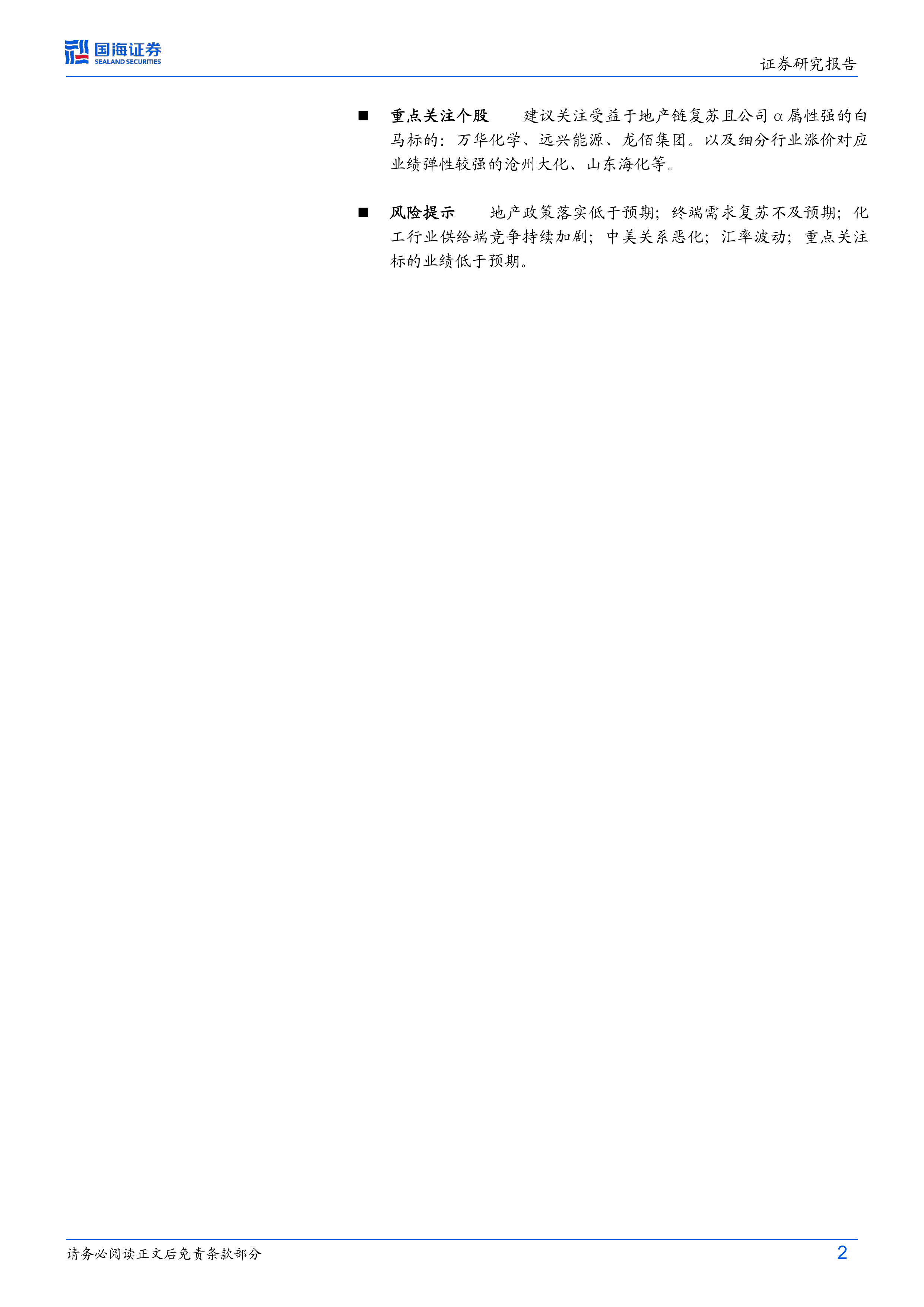 风险提示地产政策落实低于预期;终端需求复苏不及预期;化工行业供给端竞争持续加剧;中美关系恶化;汇率波动;重点关注标的业绩低于预期。
