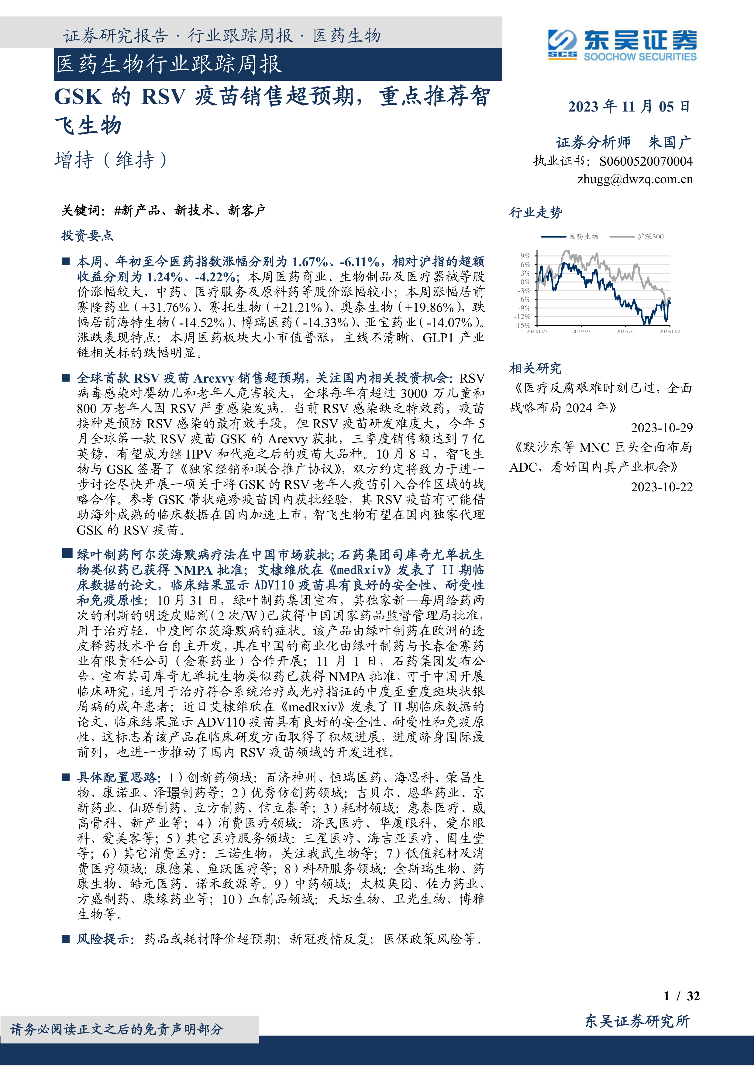 本报告的核心观点是:GSK的RSV疫苗Arexvy销售超预期,为国内RSV疫苗市场带来新的投资机会,重点推荐智飞生物。报告同时分析了医药生物行业整体走势、细分板块观点以及研发进展,并对未来市场走势进行了展望。