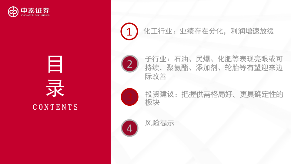 本报告对2022年前三季度化工行业整体运行情况及主要子行业的经营状况进行了深入分析,并对四季度行业发展趋势进行了展望。报告指出,化工行业业绩存在分化,部分子行业表现亮眼,部分子行业面临挑战。报告建议投资者关注供需格局向好、更具确定性的板块,并需谨慎应对行业面临的各种风险。 报告数据主要来源于Wind和中泰证券研究所,并参考了其他公开资料,力求客观公正,但投资者仍需独立判断,谨慎投资。