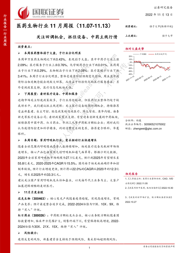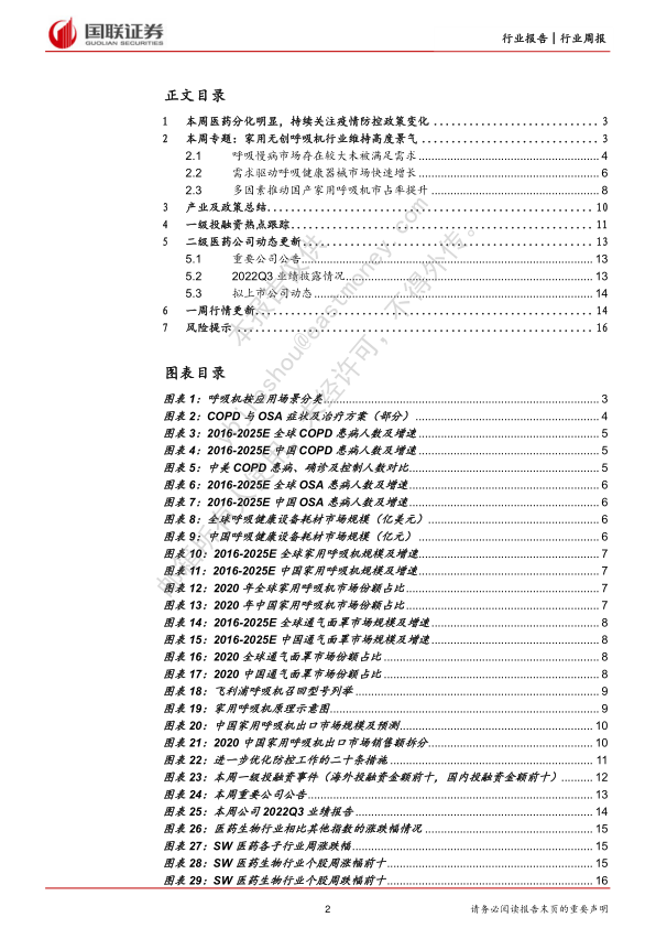 本报告分析了本周医药行业市场表现,重点关注了疫情防控政策变化对行业的影响,并对医疗设备、中药和医疗服务板块的投资机会进行了深入探讨。 报告还对家用无创呼吸机行业进行了专题分析,并总结了本周的产业政策、投融资热点以及二级市场动态。 总体而言,我们建议投资者关注行业回调机会,并重点关注医疗设备、中药和医疗服务等板块的主线行情,同时需关注疫情反复、新基建资金支持低于预期以及集采影响等风险。