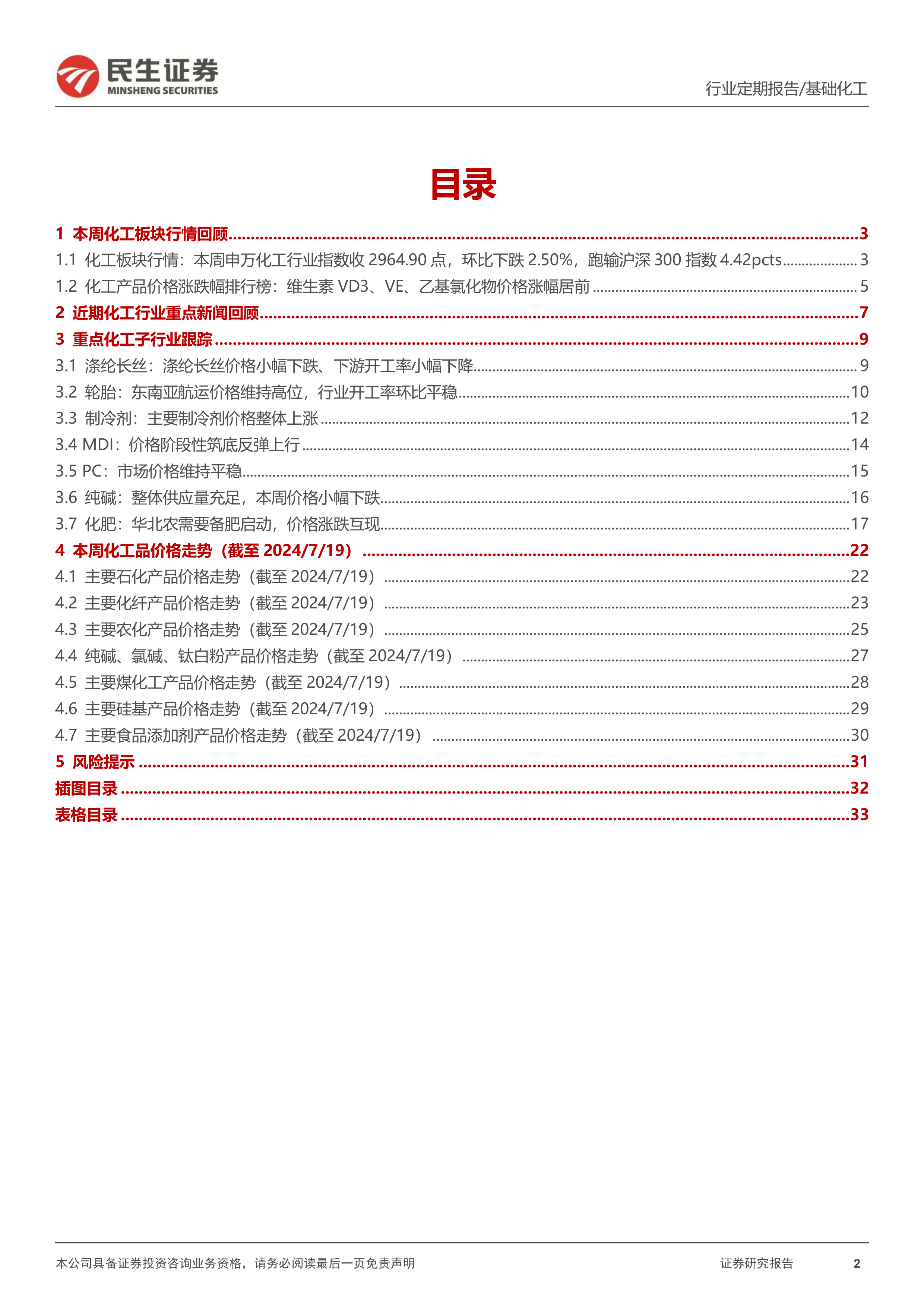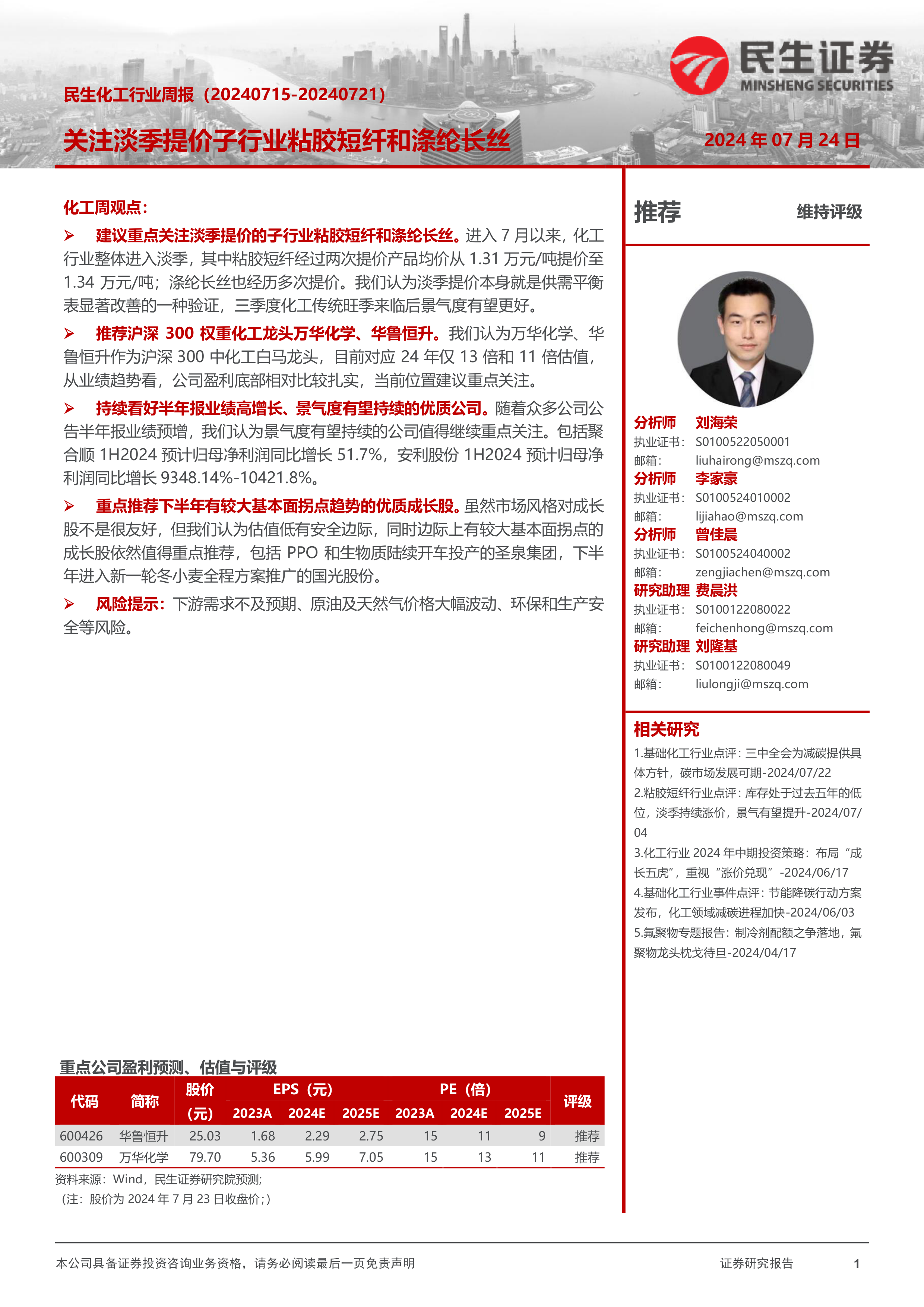 本报告对2024年7月15日至2024年7月21日期间的民生化工行业进行了周度总结。报告指出,尽管化工行业整体进入淡季,但部分子行业如粘胶短纤和涤纶长丝却逆势提价,显示供需关系改善,预示三季度传统旺季景气度有望提升。报告推荐投资者关注业绩高增长、景气度持续向好的优质公司以及下半年基本面拐点趋势明显的优质成长股,并提示了行业面临的下游需求、原材料价格波动和环保安全等风险。报告提供了大量图表数据,对各子行业的市场行情和价格走势进行了详细分析,为投资者提供了有价值的参考信息。