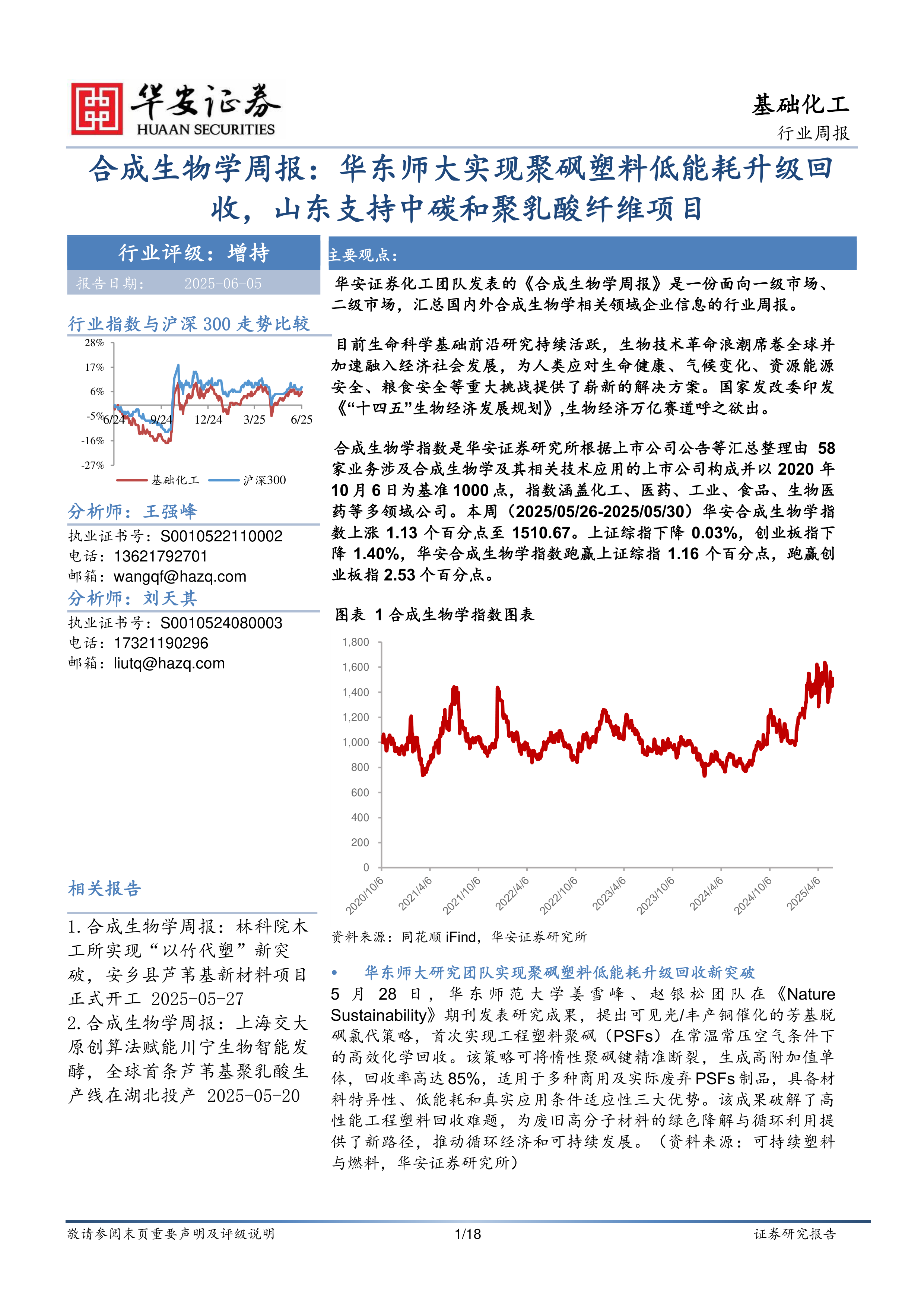 5月28日,华东师范大学姜雪峰、赵银松团队在《NatureSustainability》期刊发表研究成果,提出可见光/丰产铜催化的芳基脱砜氯代策略,首次实现工程塑料聚砜(PSFs)在常温常压空气条件下的高效化学回收。该策略可将惰性聚砜键精准断裂,生成高附加值单体,回收率高达85%,适用于多种商用及实际废弃PSFs制品,具备材料特异性、低能耗和真实应用条件适应性三大优势。该成果破解了高性能工程塑料回收难题,为废旧高分子材料的绿色降解与循环利用提供了新路径,推动循环经济和可持续发展。(资料来源:可持续塑料与燃料,华安证券研究所)