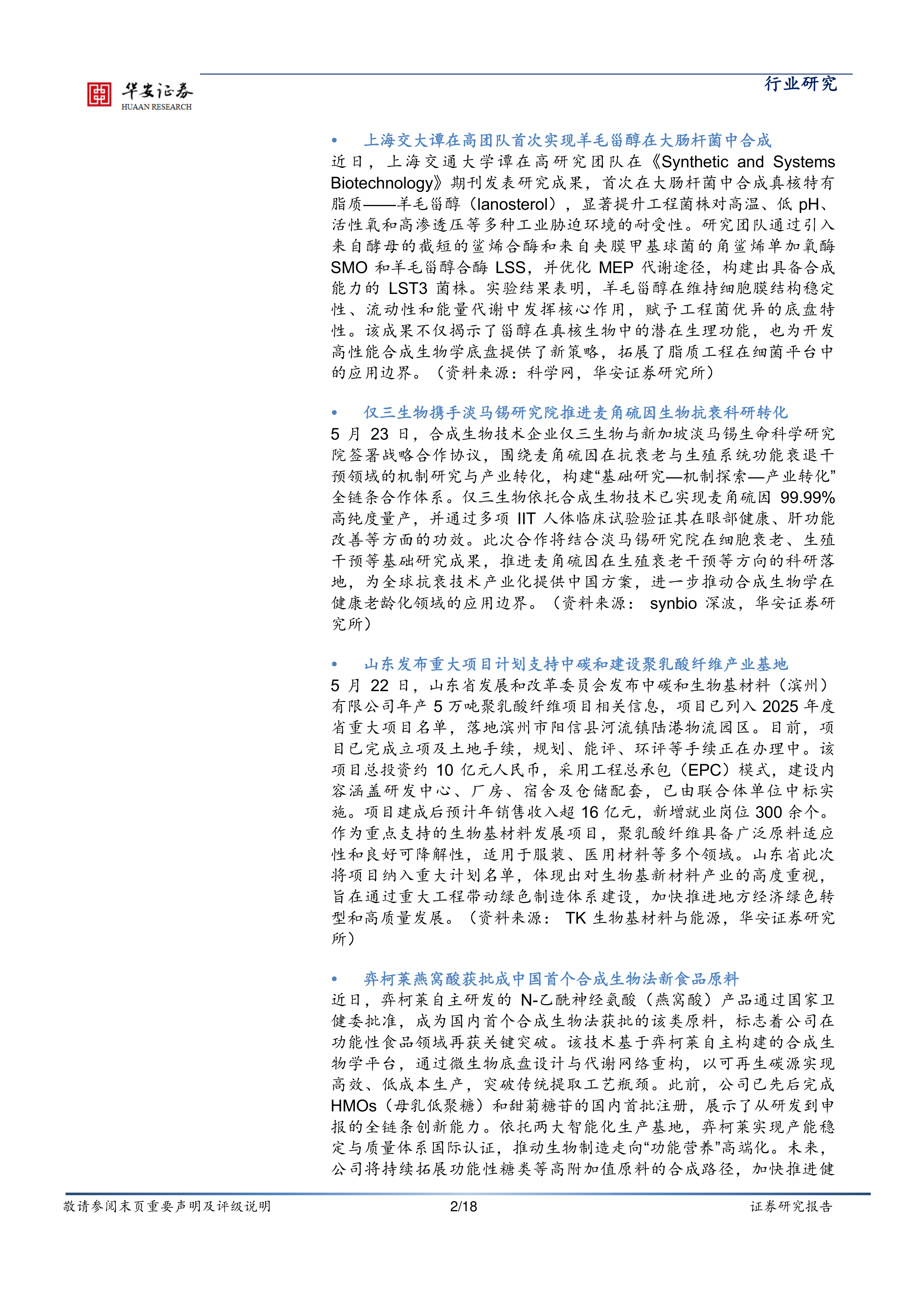 5月23日,合成生物技术企业仅三生物与新加坡淡马锡生命科学研究院签署战略合作协议,围绕麦角硫因在抗衰老与生殖系统功能衰退干预领域的机制研究与产业转化,构建“基础研究—机制探索—产业转化”全链条合作体系。仅三生物依托合成生物技术已实现麦角硫因99.99%高纯度量产,并通过多项IIT人体临床试验验证其在眼部健康、肝功能改善等方面的功效。此次合作将结合淡马锡研究院在细胞衰老、生殖干预等基础研究成果,推进麦角硫因在生殖衰老干预等方向的科研落地,为全球抗衰技术产业化提供中国方案,进一步推动合成生物学在健康老龄化领域的应用边界。(资料来源:synbio深波,华安证券研究所)