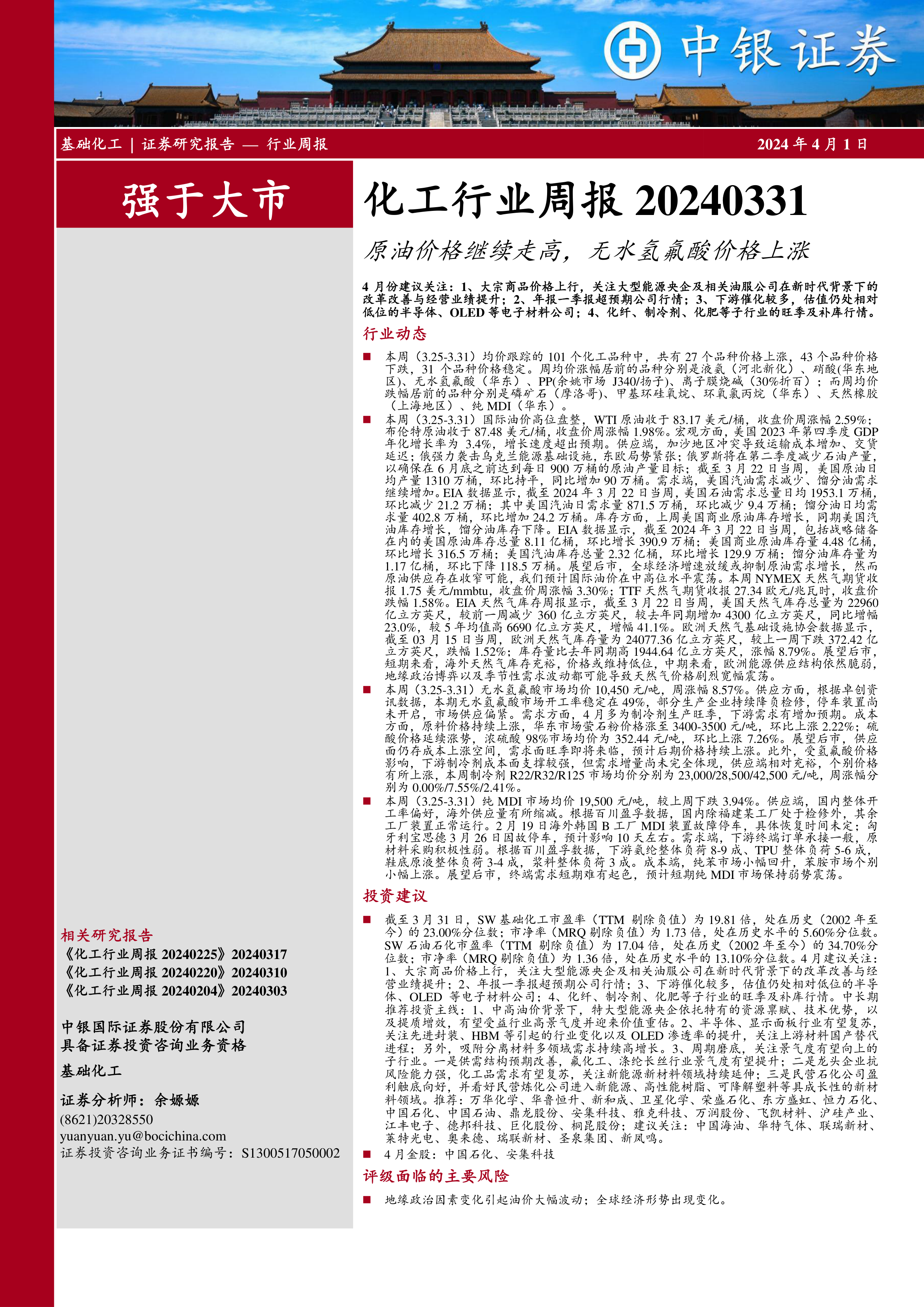 本报告的核心观点是:基础化工行业整体表现分化,部分品种价格上涨,部分品种价格下跌。原油价格继续走高,对相关化工产品价格产生影响。建议关注大宗商品价格上行带来的投资机会,以及年报一季报超预期公司和估值较低的电子材料公司。中长期来看,建议关注大型能源央企、半导体材料、OLED材料以及氟化工等子行业。