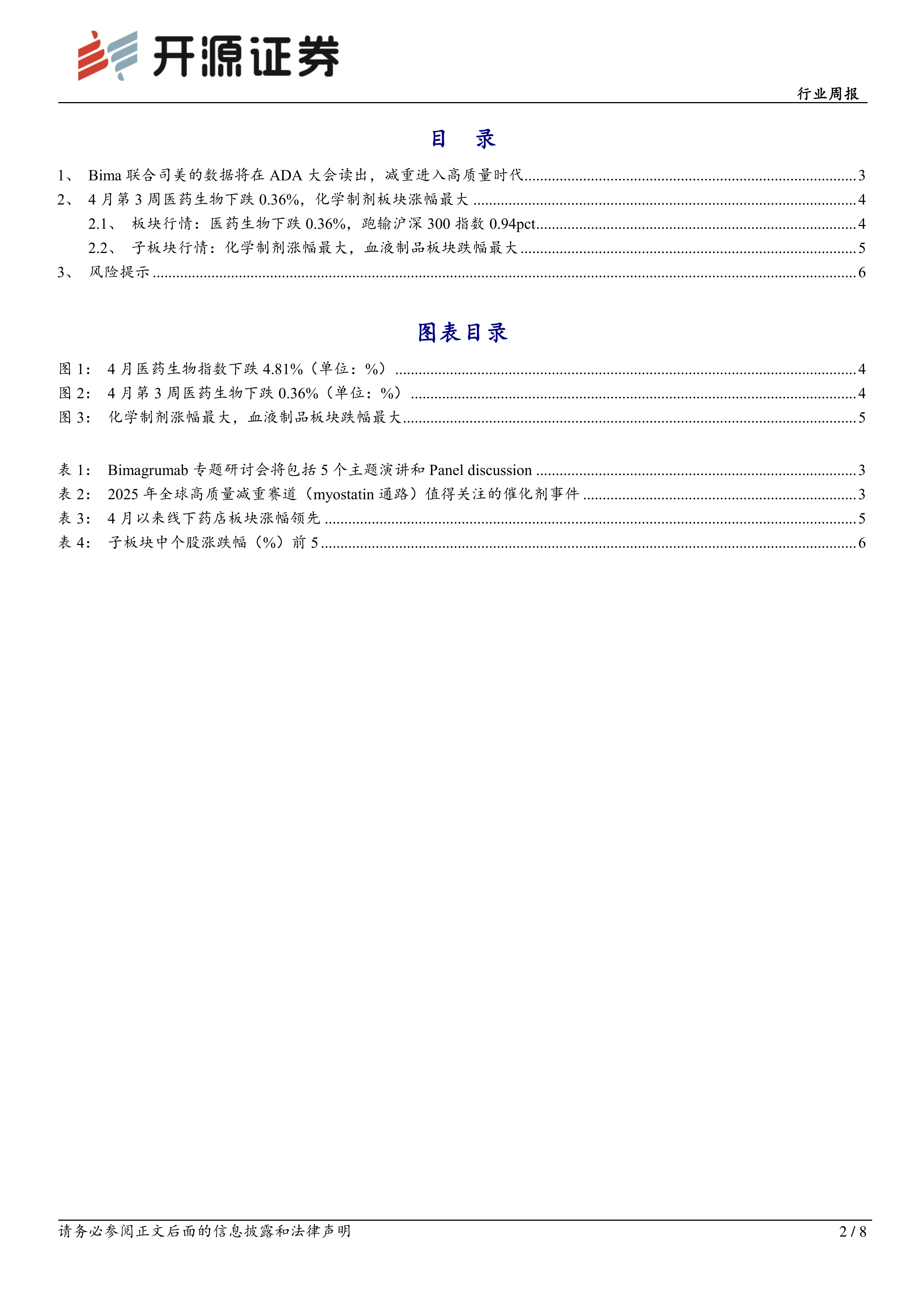 本报告的核心观点是:GLP-1减重药物虽然有效,但存在瘦体重流失的副作用,而myostatin通路抑制剂有望解决这一问题,提升减重疗法的质量。Bimagrumab联合司美格鲁肽的II期临床试验数据将于2025年6月ADA大会公布,其结果将对该领域发展产生重大影响。此外,报告还分析了2025年4月第3周医药生物行业的整体表现及各子板块的涨跌情况。
