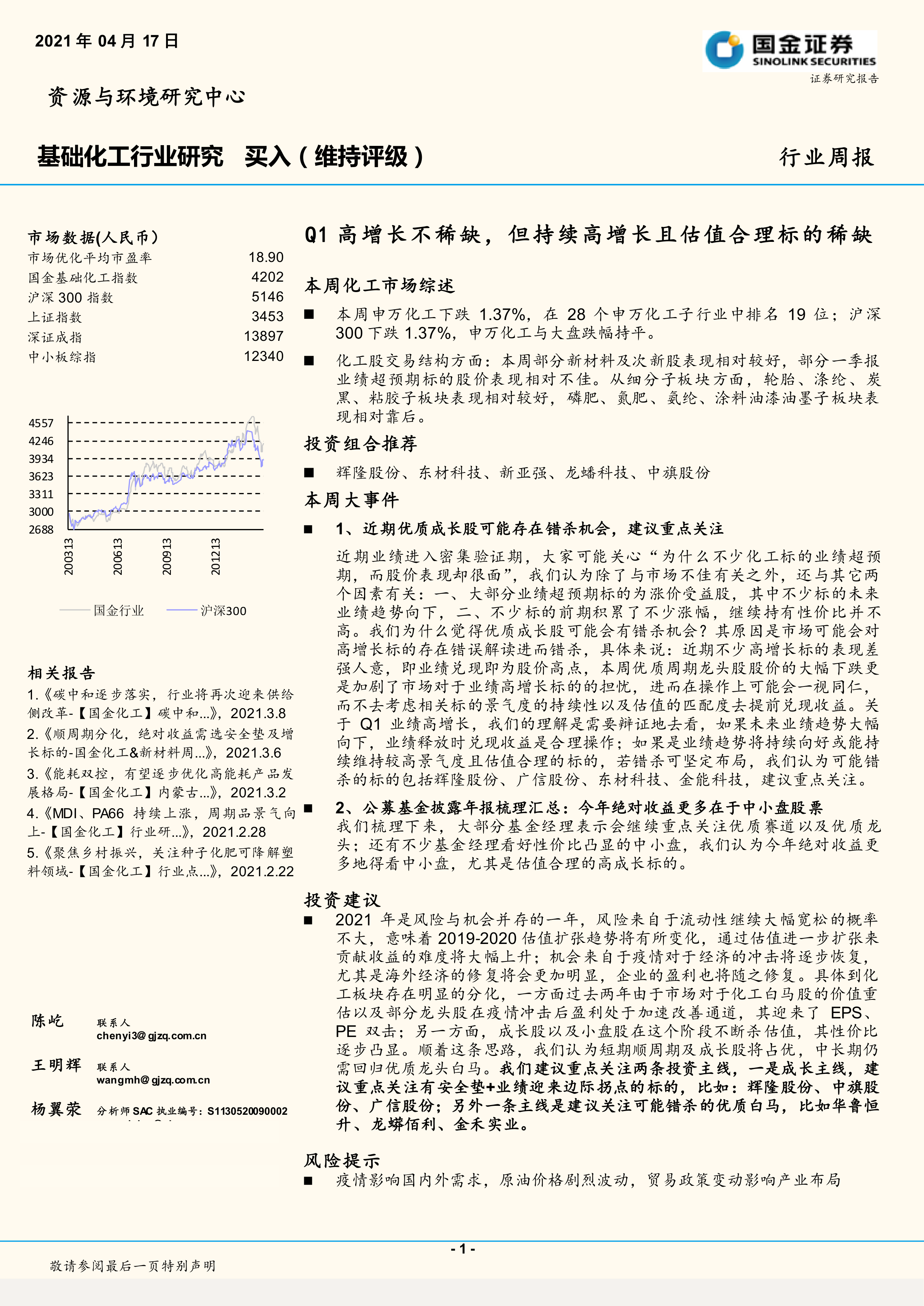 基础化工行业研究周报:Q1高增长不稀缺,但持续高增长且估值合理标的稀缺