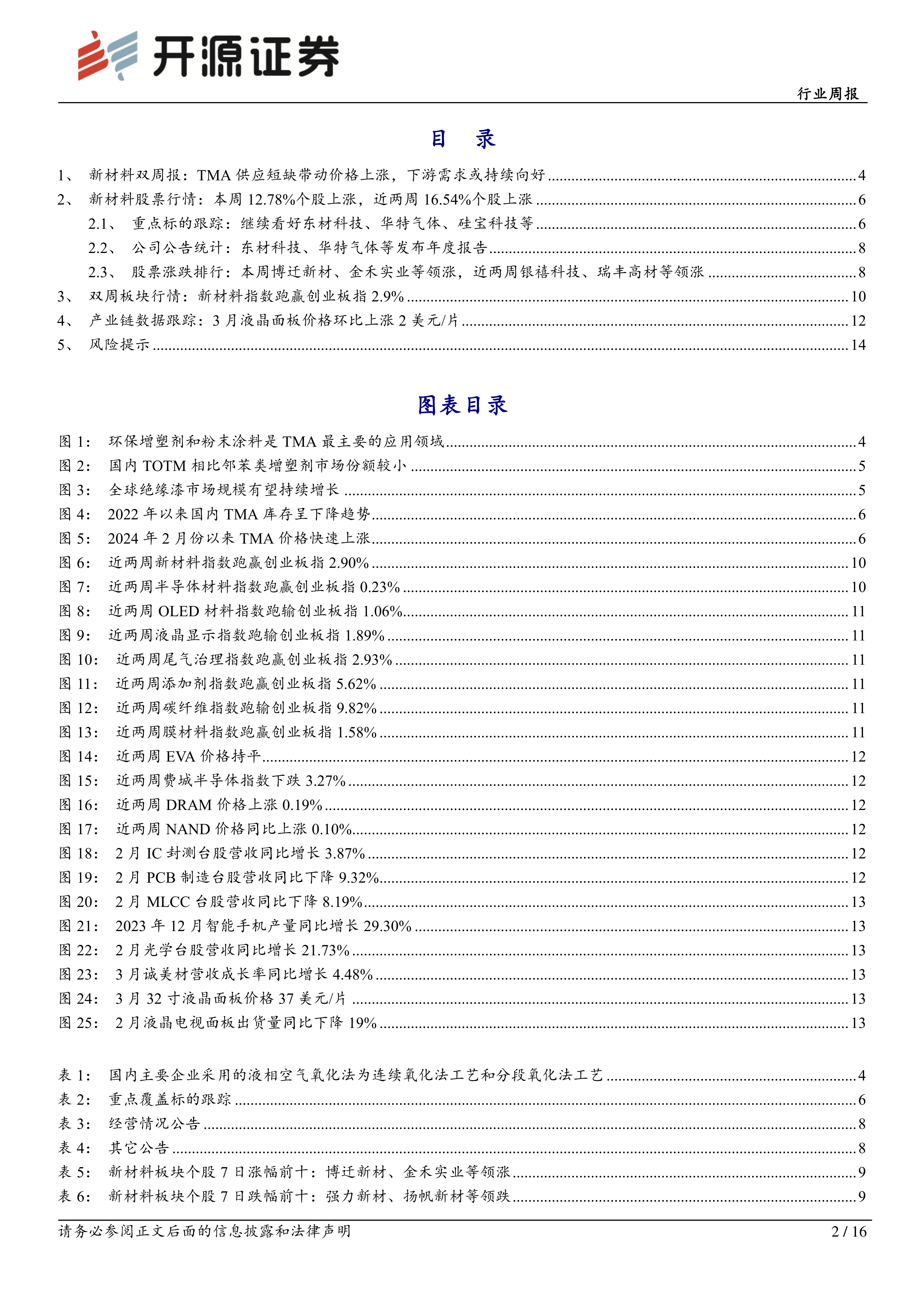 本报告通过对TMA市场供需现状、价格走势以及相关上市公司业绩的分析,得出结论:TMA供应短缺导致价格大幅上涨,而下游需求持续向好,这将显著利好国内TMA生产企业。报告建议关注正丹股份、百川股份和泰达新材等龙头企业。同时,报告还对新材料板块的整体市场行情、重点标的股票以及相关产业链数据进行了跟踪和分析,为投资者提供参考。 需要注意的是,报告中提到的风险提示,例如技术突破不及预期、行业竞争加剧以及原材料价格波动等,也需要投资者充分考虑。