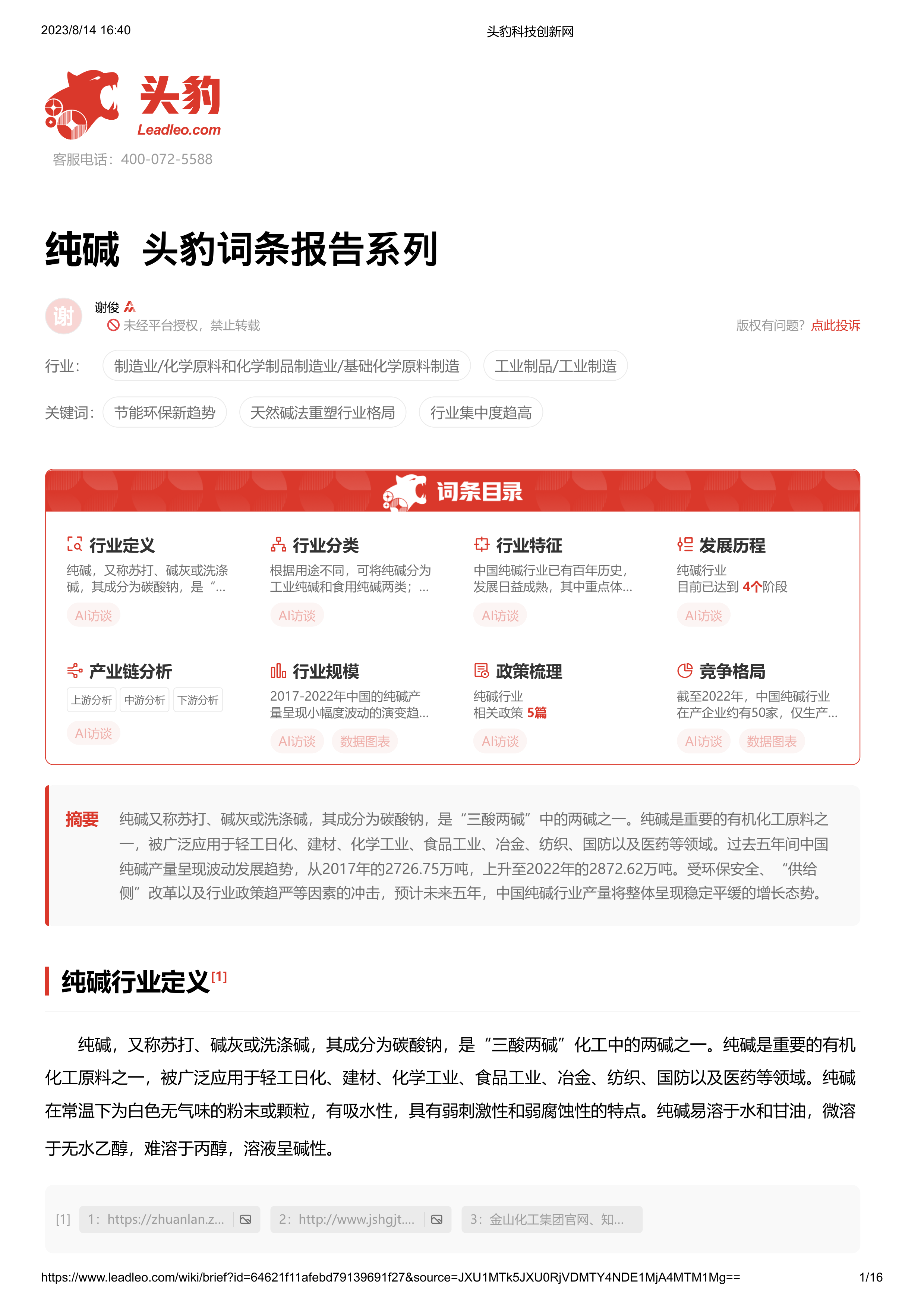 本报告基于头豹科技创新网提供的纯碱行业报告数据,对中国纯碱行业市场进行统计分析,核心观点如下: