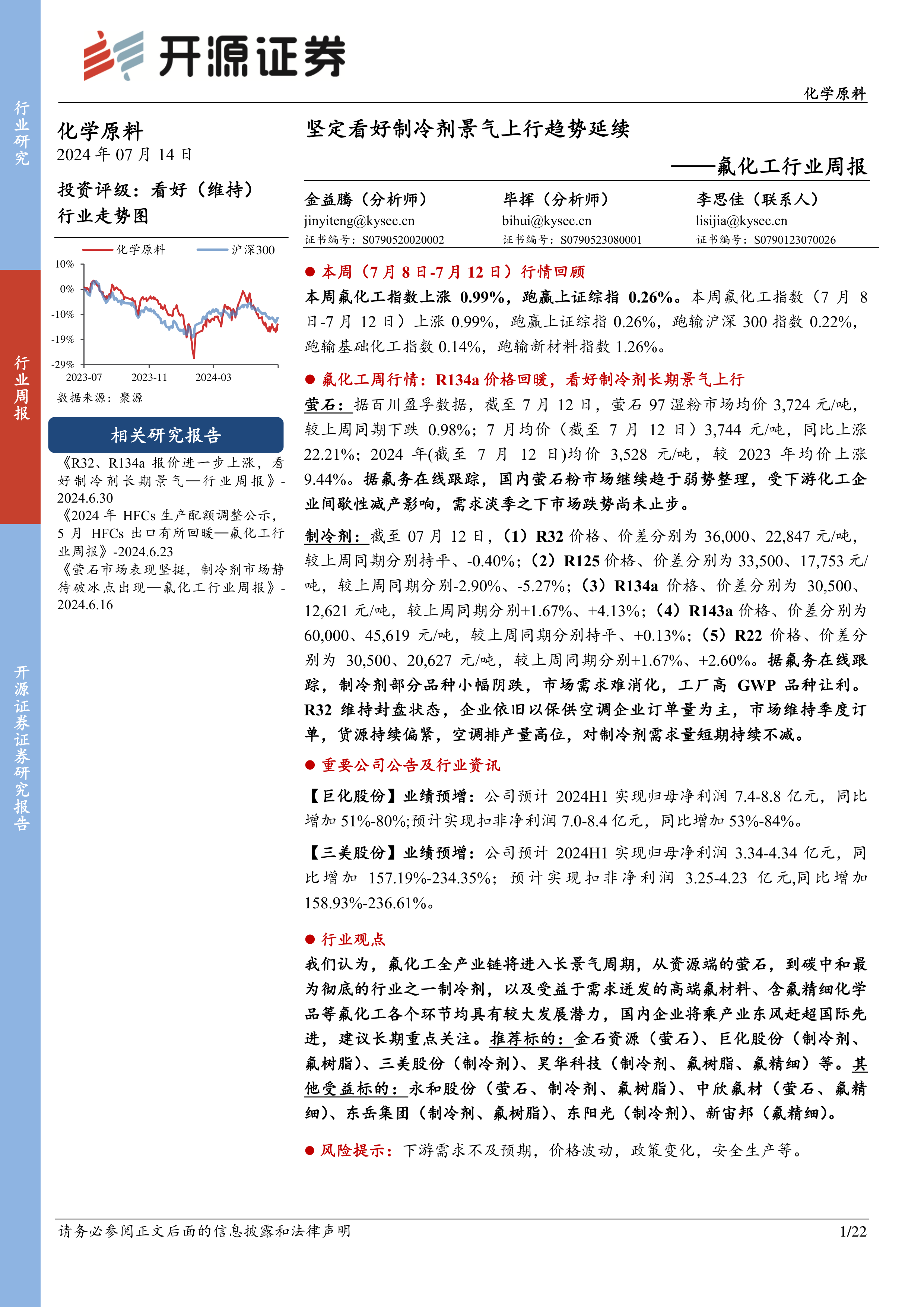 本部分报道了巨化股份、三美股份、东阳光等公司发布的2024年半年度业绩预告,以及天津长芦氟化液扩建项目环评公示和福建九鼎氟化盐项目竣工验收公示等行业新闻。