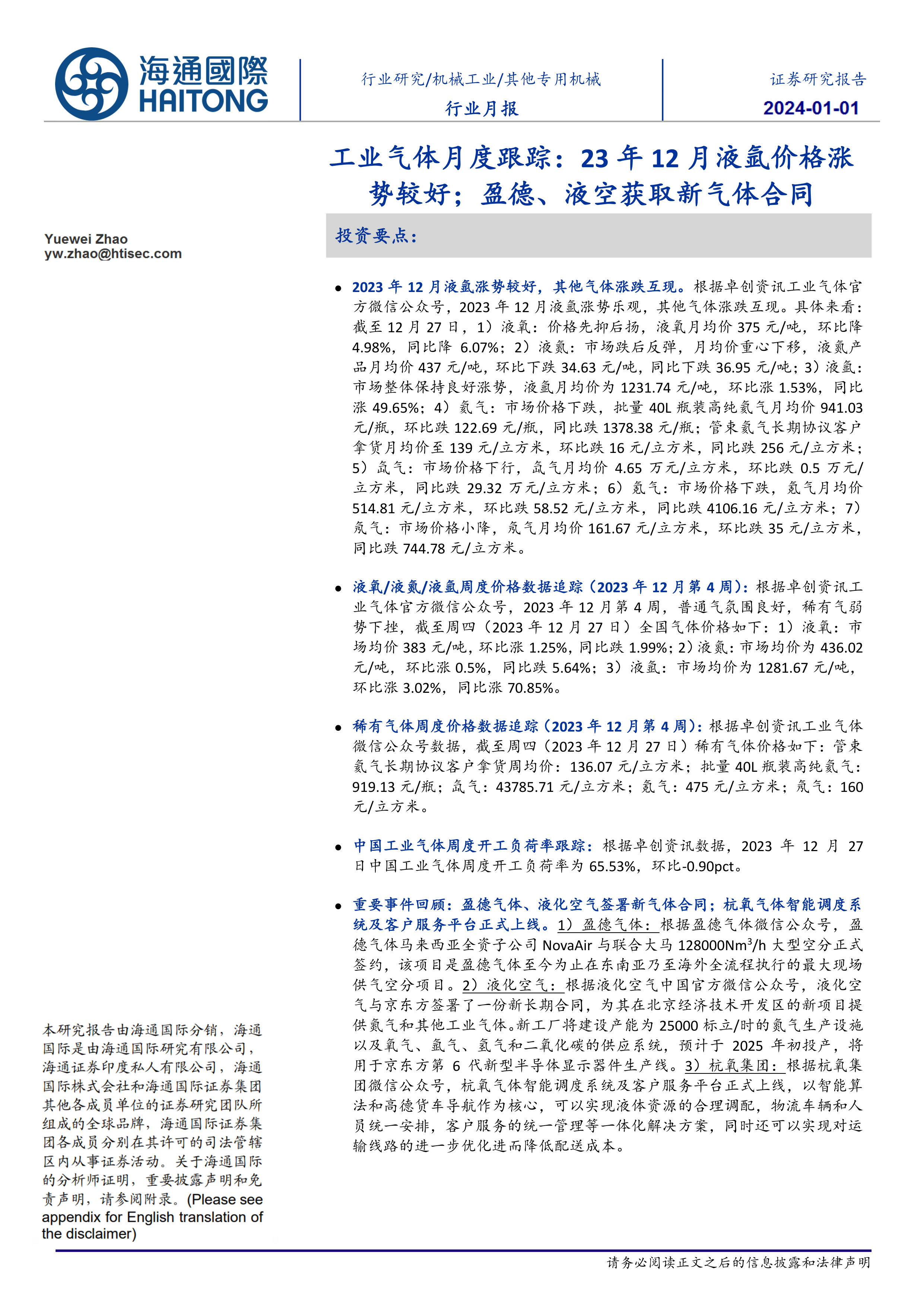 工业气体月度跟踪:23年12月液氩价格涨势较好;盈德、液空获取新气体合同