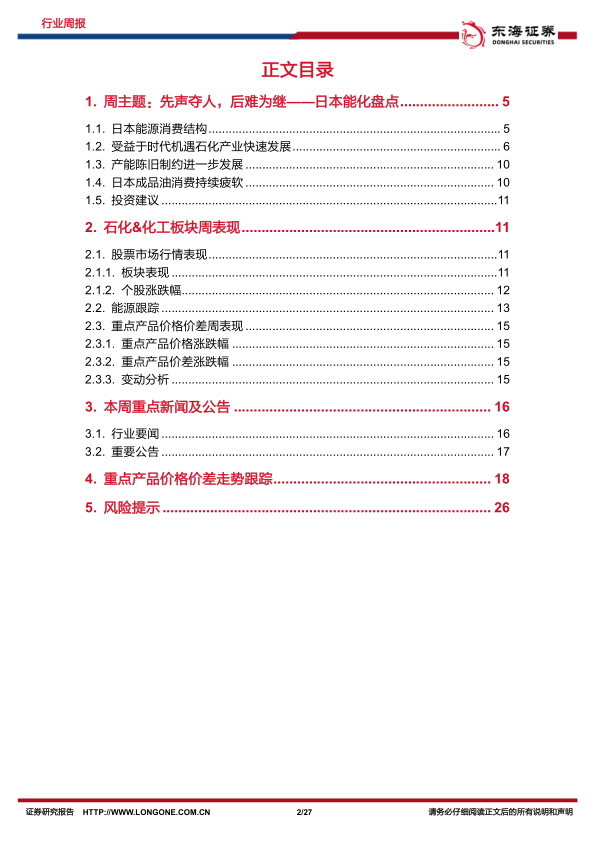 本报告以日本石化产业为主题,通过数据和统计分析,对日本能源消费结构、石化产业发展历程、产能现状以及成品油消费情况进行了深入剖析,并对未来发展趋势进行了预测。报告还对中国石化及化工板块的周表现、能源市场动态、重点产品价格及价差进行了跟踪,并对部分重点产品价格波动原因进行了分析。最后,报告总结了行业风险并提出了投资建议。