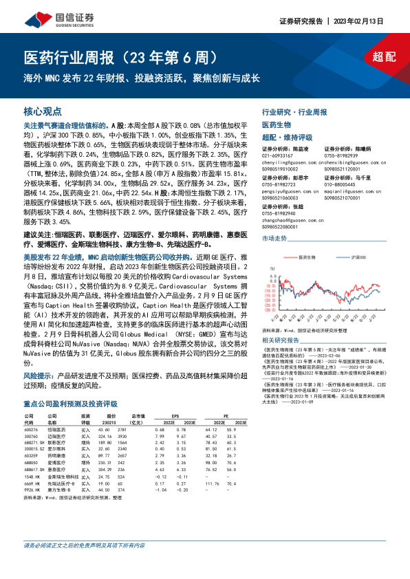 美股发布22年业绩,MNC启动创新生物医药公司收并购。近期GE医疗、雅培等纷纷发布2022年财报,启动2023年创新生物医药公司投融资项目。2月8日,雅培宣布计划以每股20美元的价格收购CardiovascularSystems(Nasdaq:CSII),交易价值约为8.9亿美元。CardiovascularSystems拥有丰富冠脉及外周产品线,将补全雅培血管介入产品业务。2月9日GE医疗宣布与CaptionHealth签署收购协议,CaptionHealth是医疗领域人工智能(AI)技术开发的领跑者,其开发的AI应用可以帮助早期疾病检测,并使用AI简化和加速超声检查,支持更多的临床医师进行基本的超声心动图检查。2月9日骨科机器人公司GlobusMedical(NYSE:GMED)宣布与达成骨科脊柱公司NuVasive(Nasdaq:NUVA)合并全股票交易协议,该交易对NuVasive的估值为31亿美元,Globus股东拥有新合并公司约四分之三的股份。