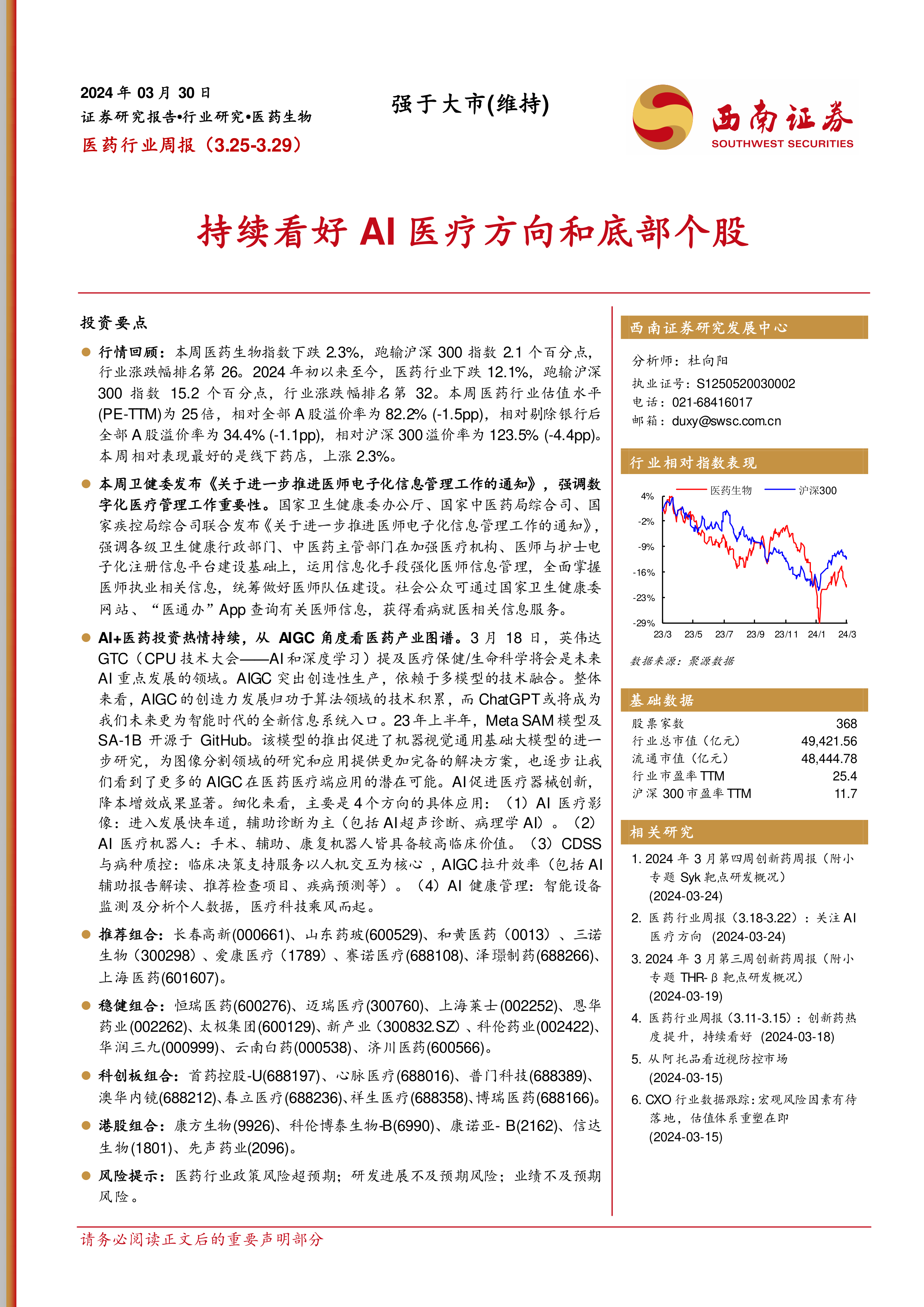 本报告对 2024年3月25日至29日一周的医药行业进行了全面的分析。报告指出,本周医药行业整体表现弱于大盘,但AI医疗方向和底部个股的长期投资价值值得关注。报告提供了丰富的市场数据和信息,包括行业指数、个股涨跌幅、资金流向、政策法规以及研究报告等,为投资者提供了较为全面的参考信息。 然而,投资者仍需谨慎,并注意报告中提到的风险提示。