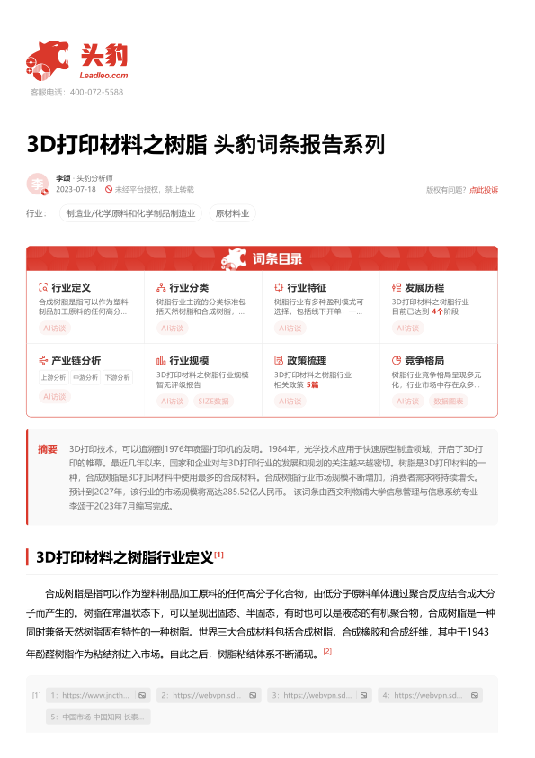 本报告基于Leadleo.com提供的关于3D打印材料之树脂的行业报告,对中国3D打印树脂材料市场进行统计数据分析,并从行业定义、分类、特征、发展历程、产业链、市场规模、政策环境、竞争格局以及代表企业等多个维度进行深入解读。报告核心观点如下: