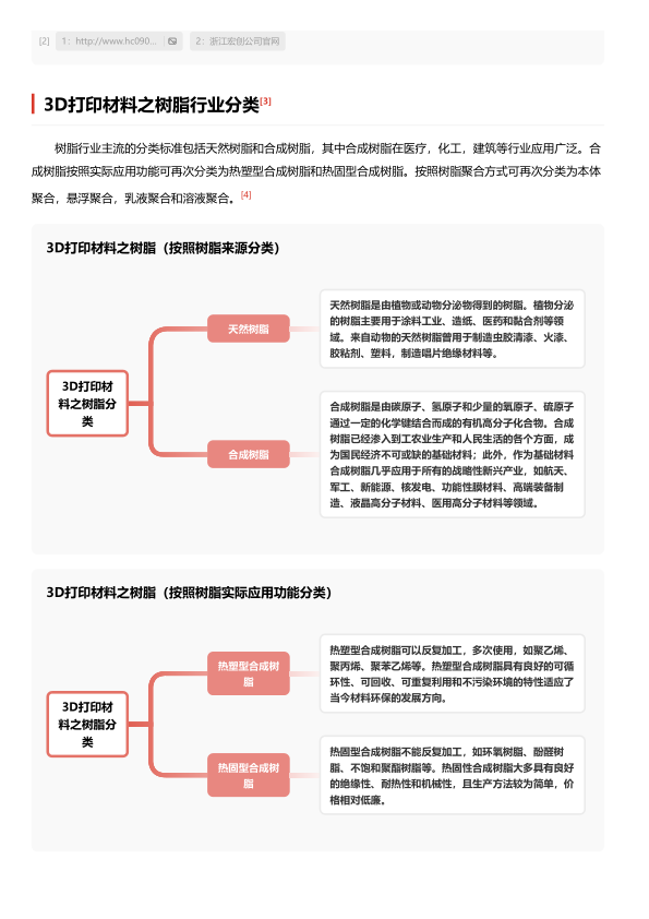 报告首先对3D打印树脂材料进行了定义,将其分为天然树脂和合成树脂,并进一步根据实际应用功能(热塑型和热固型)以及聚合方式(本体聚合、悬浮聚合、乳液聚合和溶液聚合)进行分类。合成树脂是3D打印材料的主要组成部分,广泛应用于医疗、化工、建筑等领域。