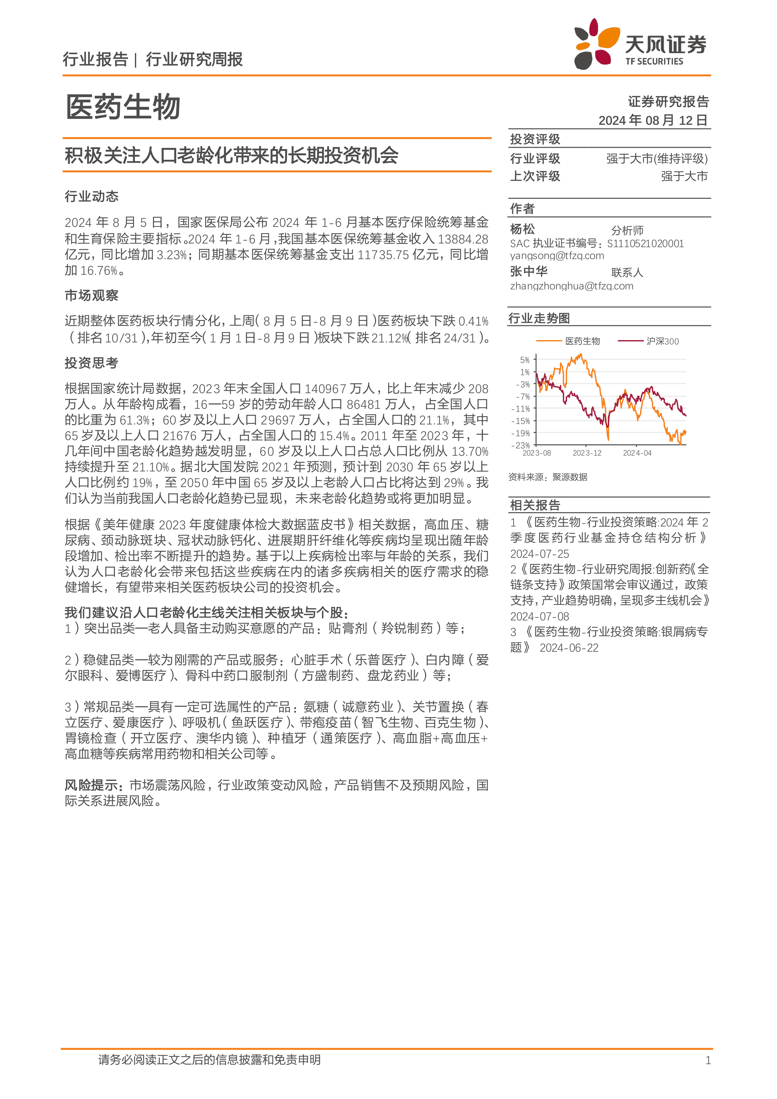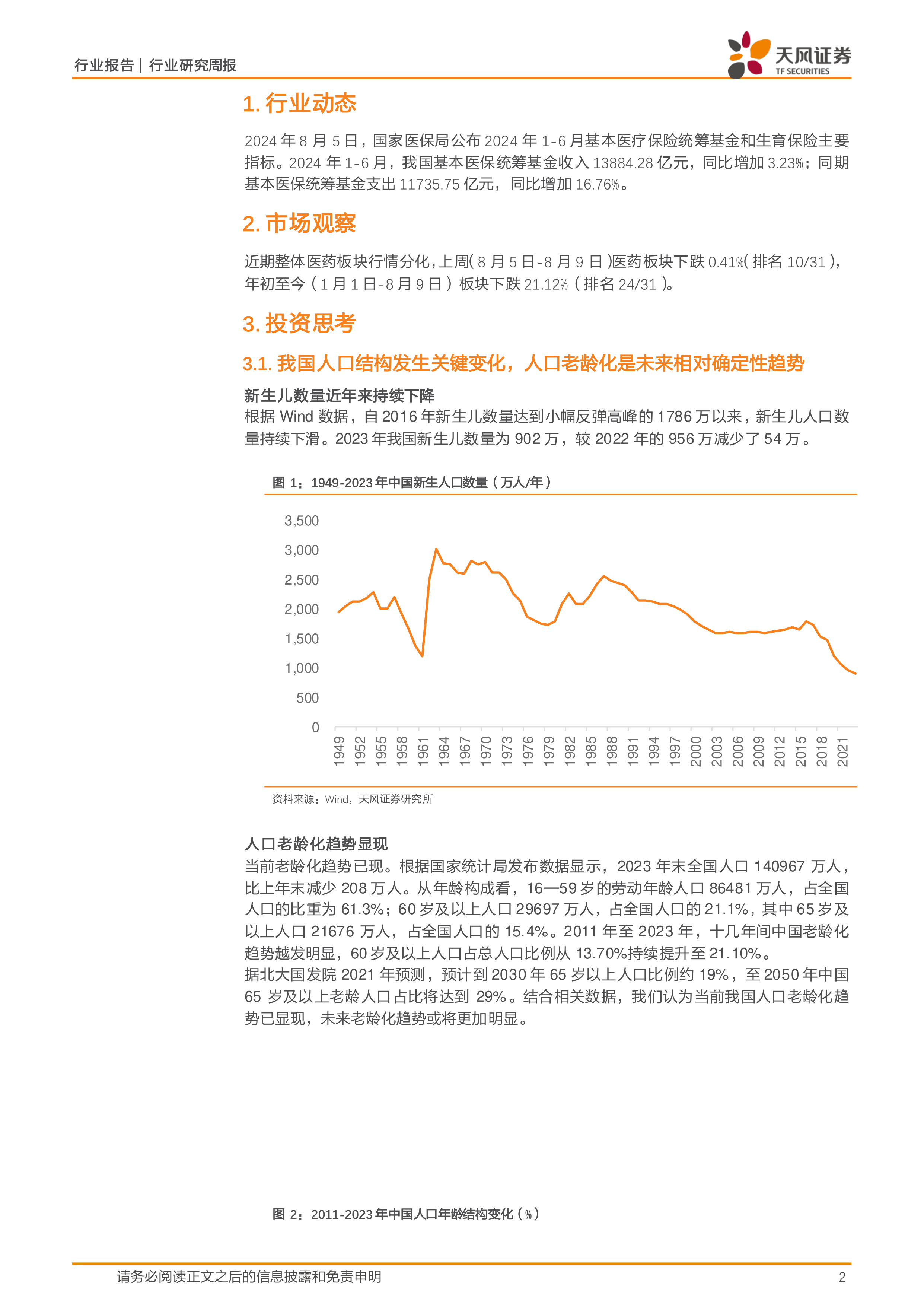 报告对近期医药板块行情进行了观察。数据显示,上周医药板块下跌0.41%,年初至今下跌21.12%。这表明医药板块行情存在分化,但长期来看,人口老龄化带来的增长潜力依然值得关注。