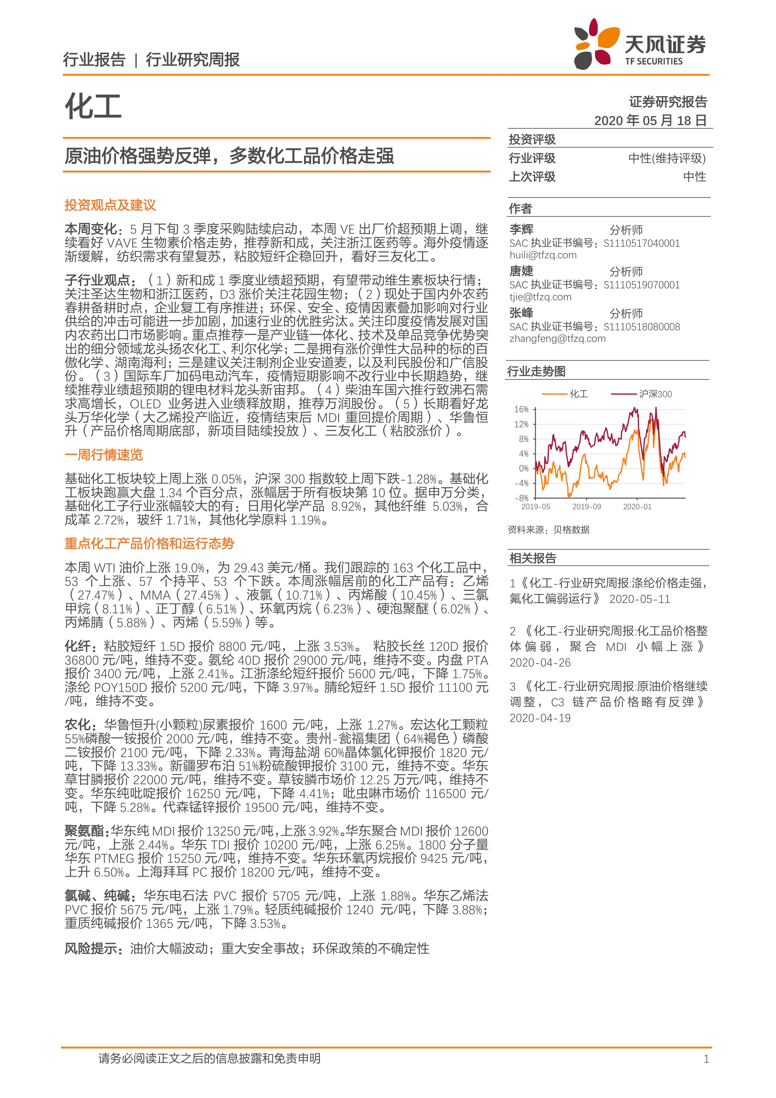 本报告通过对化工行业近期市场表现、重点产品价格波动以及行业新闻的分析,得出原油价格反弹推动多数化工品价格上涨,但不同子行业及个股表现差异较大的结论。报告建议投资者关注维生素、农药、锂电材料等细分领域,并重点关注行业龙头企业,同时需警惕油价波动、安全事故和环保政策等风险。 报告提供的详细数据和图表,为投资者提供了较为全面的市场分析和投资参考。