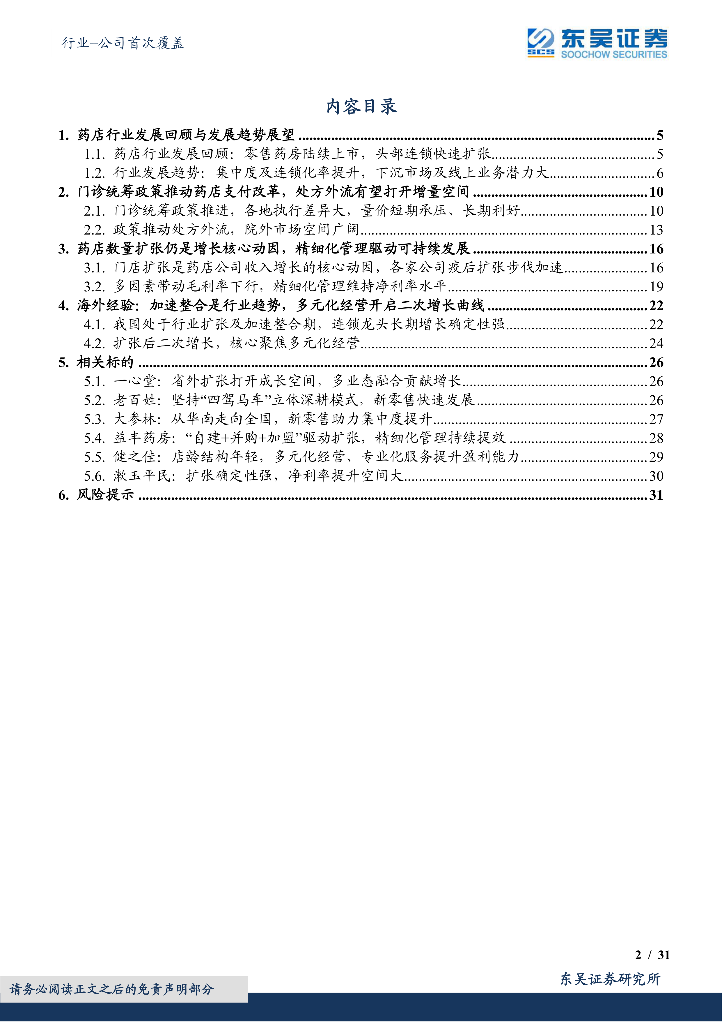 本报告的核心观点是:连锁药店行业中长期投资逻辑依然有效,即处方外流和行业集中度提升。虽然门诊统筹政策的落地在短期内对药店经营造成一定压力(量价承压),但长期来看将利好行业发展。目前药店板块估值处于历史低位,随着经营状况改善和门诊统筹政策边际效应的显现,药店板块有望实现业绩和估值双提升。头部药店公司仍处于扩张期,未来多元化经营有望开启二次增长曲线。