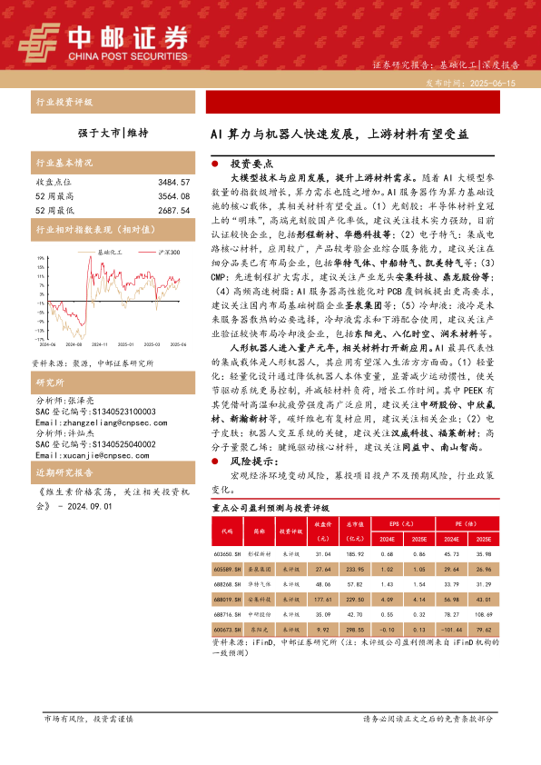 本报告的核心观点是:AI算力和机器人技术的快速发展,将显著提升上游基础化工材料的需求。报告重点分析了大模型技术更迭对半导体材料(光刻胶、电子特气、CMP抛光材料等)以及服务器材料(高频高速树脂、冷却液)需求的拉动作用,并探讨了人形机器人量产对轻量化材料(PEEK、碳纤维)、电子皮肤材料以及超高分子量聚乙烯等材料需求的积极影响。报告最后列举了相关受益公司,但需注意宏观经济环境变动、募投项目投产不及预期以及行业政策变化等风险。