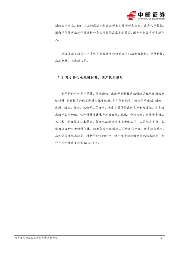 光刻胶是半导体微纳加工的核心材料,其技术指标直接影响集成电路的性能和良品率。报告分析了光刻胶的应用场景、成本结构以及国内外市场竞争格局,指出国内高端光刻胶国产化率低,但随着下游对国产化需求的迫切,国内企业市占率有望加速增长。