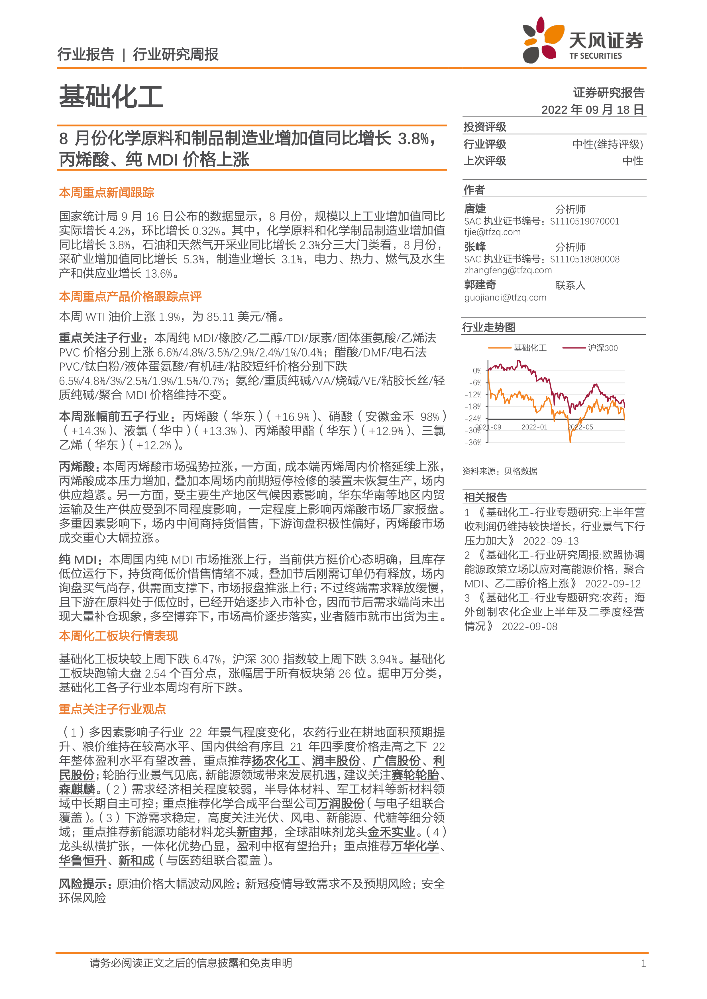 基础化工行业研究周报:8月份化学原料和制品制造业增加值同比增长3.8%,丙烯酸、纯MDI价格上涨