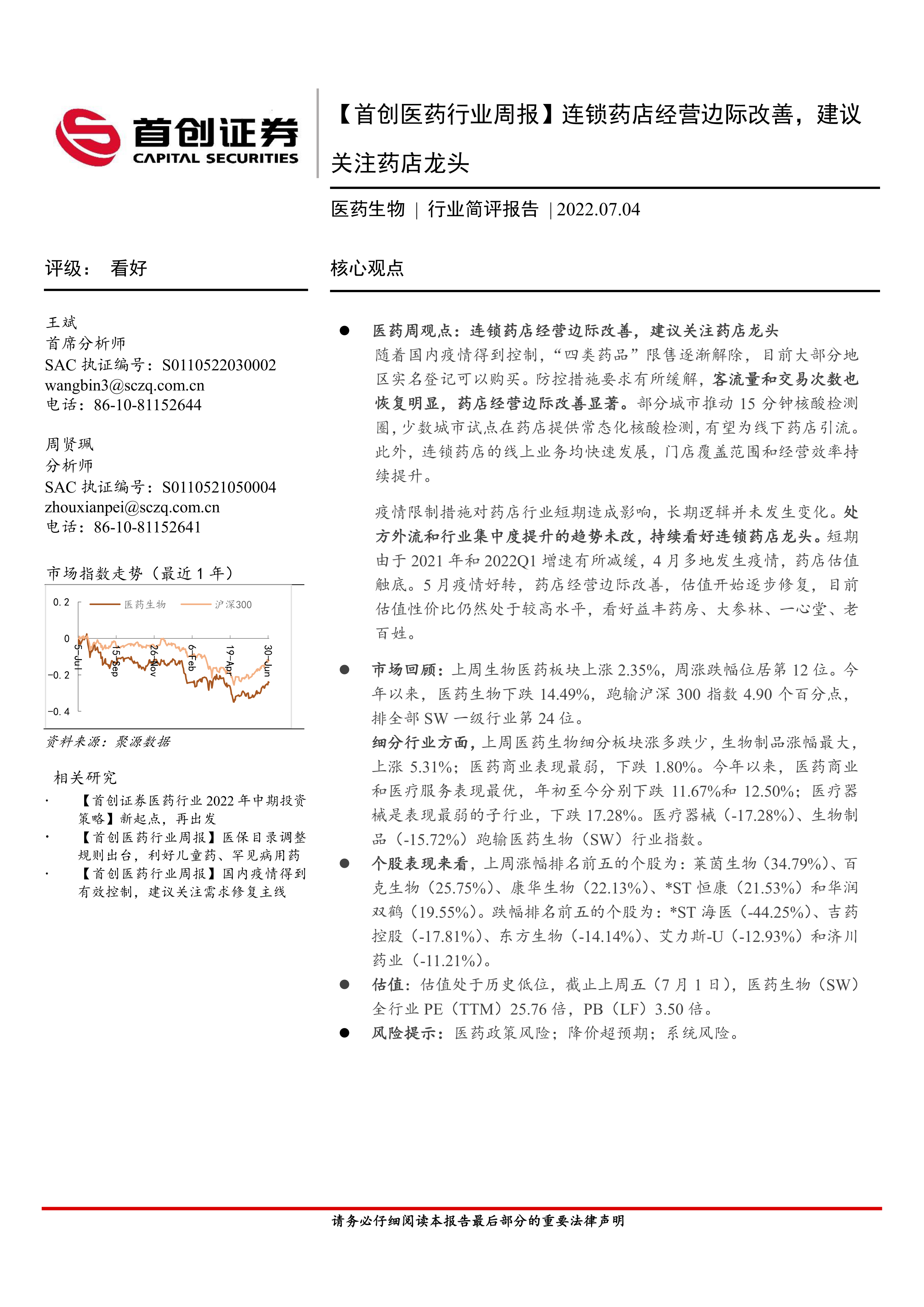 报告指出,由于2020年疫情相关产品销售基数较高,2021年连锁药店收入增速有所放缓,导致估值触底。但随着疫情好转和经营边际改善,估值开始修复,目前仍处于较高水平,具有投资价值。报告建议关注益丰药房、大参林、一心堂、老百姓等连锁药店龙头企业。