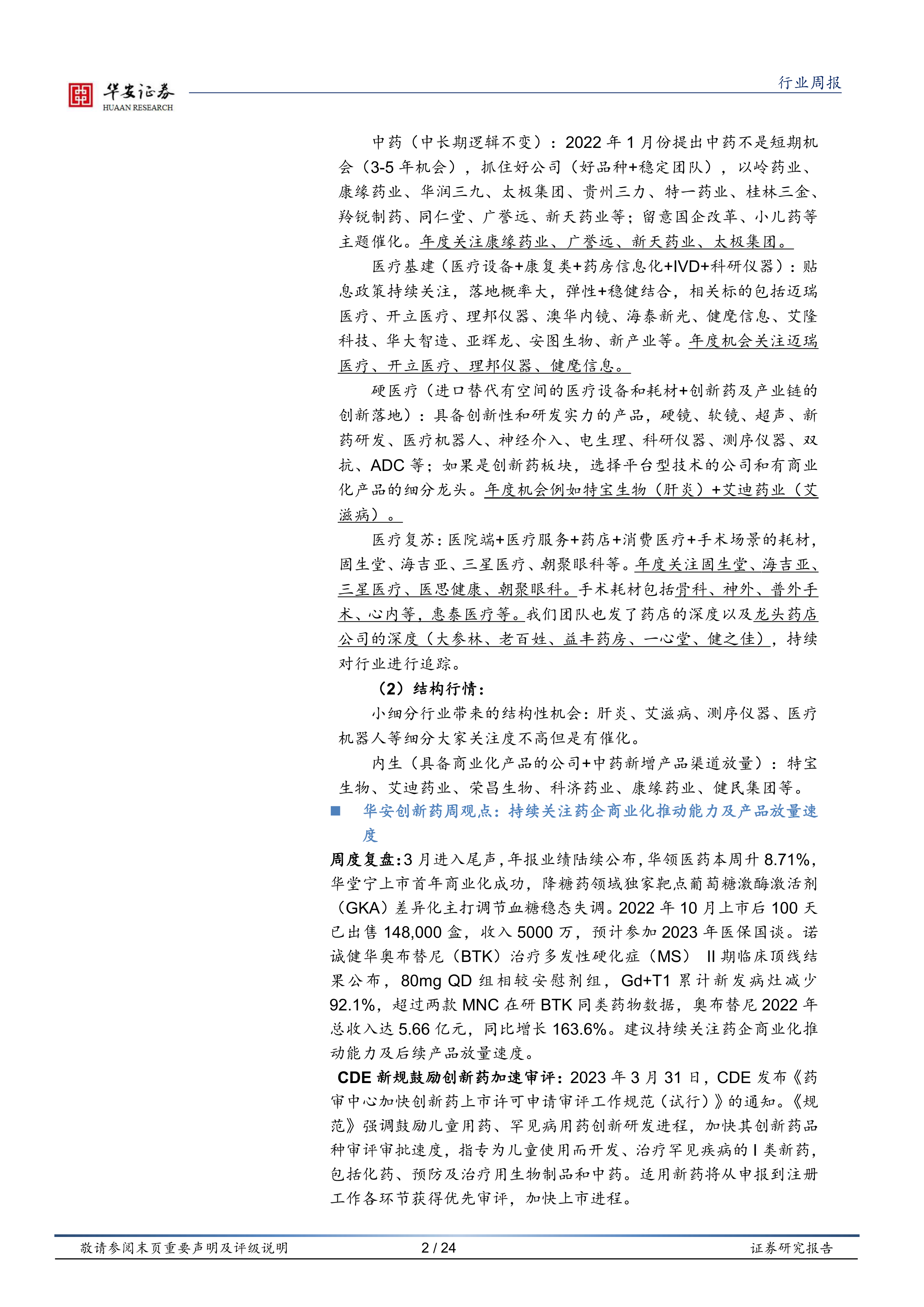 周度复盘: 3 月进入尾声, 年报业绩陆续公布, 华领医药本周升 8.71%,华堂宁上市首年商业化成功, 降糖药领域独家靶点葡萄糖激酶激活剂(GKA) 差异化主打调节血糖稳态失调。 2022 年 10 月上市后 100 天已出售 148,000 盒, 收入 5000 万, 预计参加 2023 年医保国谈。 诺诚健华奥布替尼(BTK) 治疗多发性硬化症(MS) II 期临床顶线结果公布, 80mg QD 组相较安慰剂组, Gd+T1 累计新发病灶减少92.1%, 超过两款 MNC 在研 BTK 同类药物数据, 奥布替尼 2022 年总收入达 5.66 亿元, 同比增长 163.6%。 建议持续关注药企商业化推动能力及后续产品放量速度。