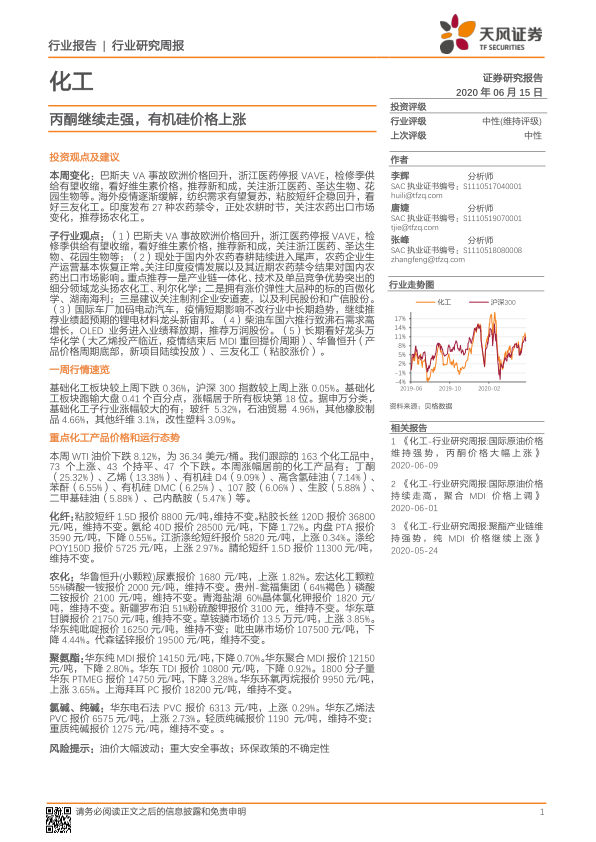 报告基于本周市场变化,提出了具体的投资建议,包括推荐新和成、扬农化工、新宙邦、万润股份、万华化学、华鲁恒升和三友化工等个股,并建议关注浙江医药、圣达生物、花园生物、利尔化学、百傲化学、湖南海利、安道麦、利民股份和广信股份等。报告也指出了油价大幅波动、重大安全事故和环保政策不确定性等风险。