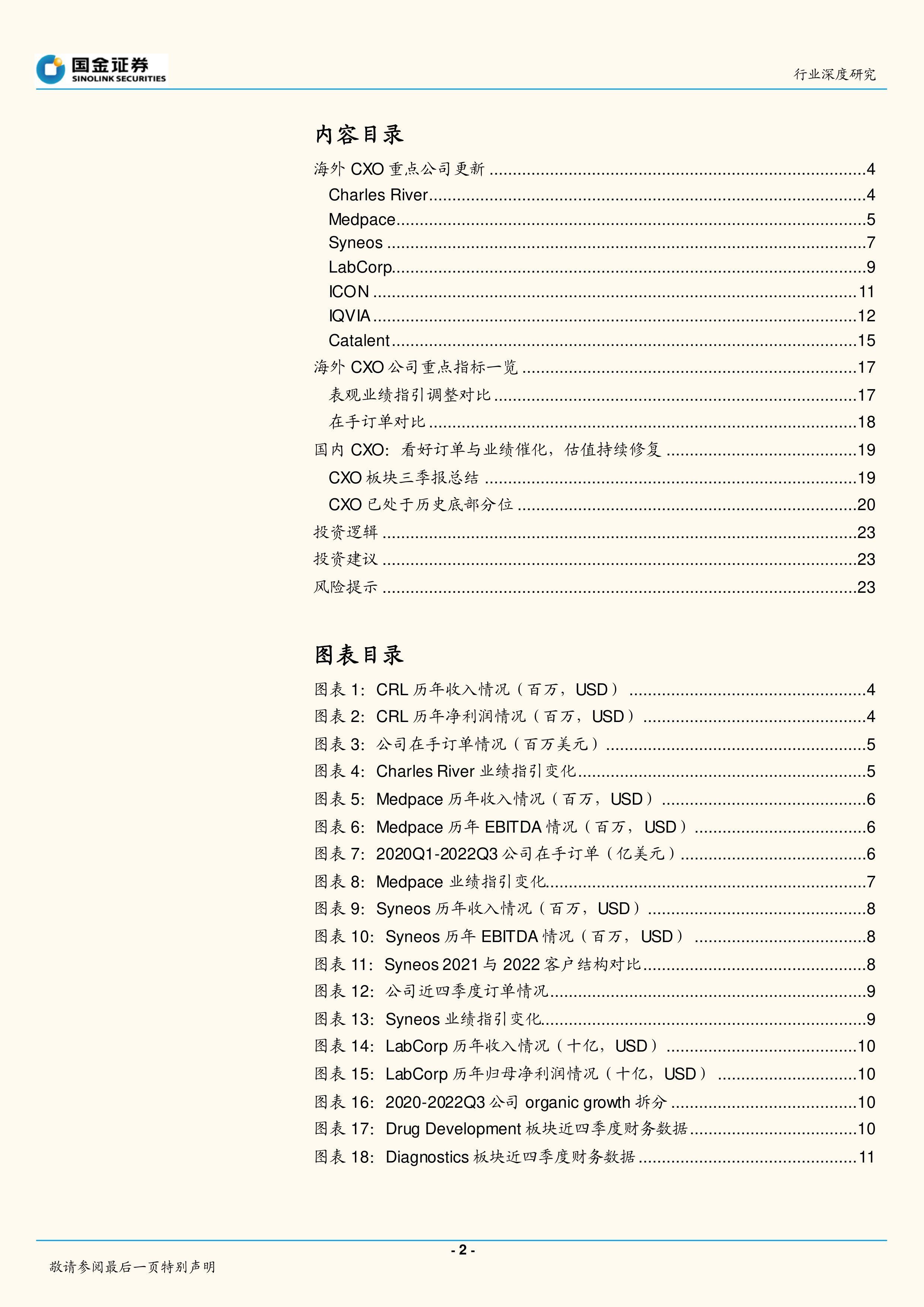 报告分别对Charles River、Medpace、Syneos、LabCorp、ICON、IQVIA和Catalent等多家海外CXO龙头企业进行了详细的业绩分析,涵盖了收入、利润、在手订单、业绩指引调整等关键指标。分析显示,尽管部分公司受到新冠业务退坡或宏观经济因素的影响,但非新冠业务需求持续强劲增长,整体市场保持稳健发展态势。