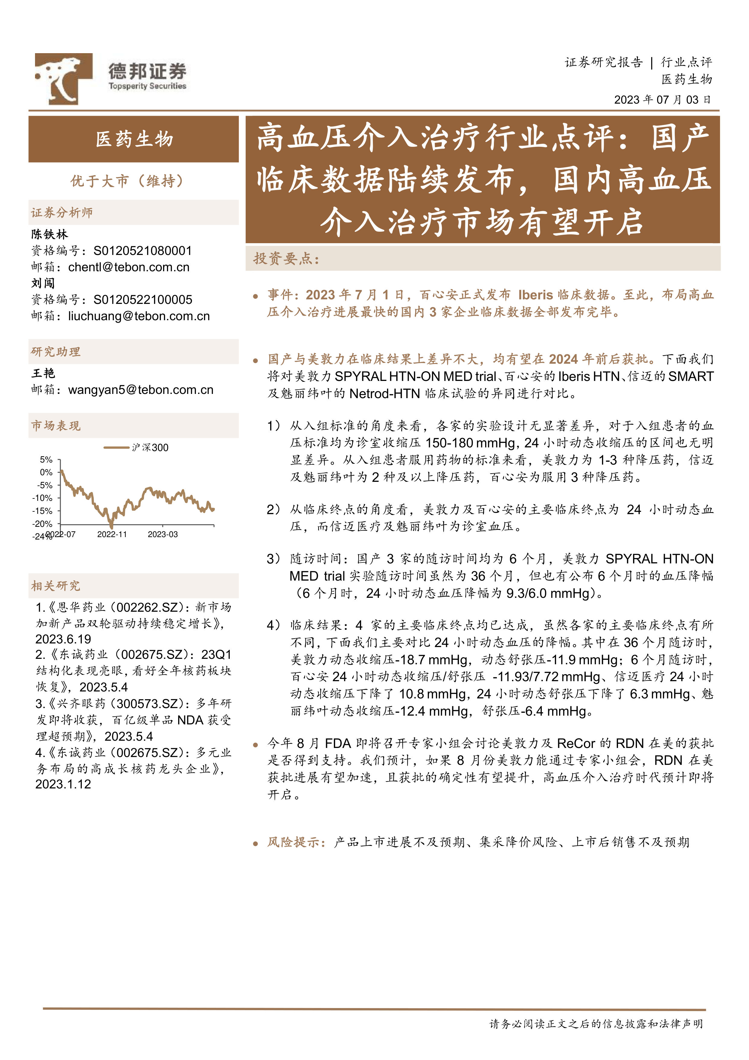 事件:2023年7月1日,百心安正式发布Iberis临床数据。至此,布局高血压介入治疗进展最快的国内3家企业临床数据全部发布完毕。