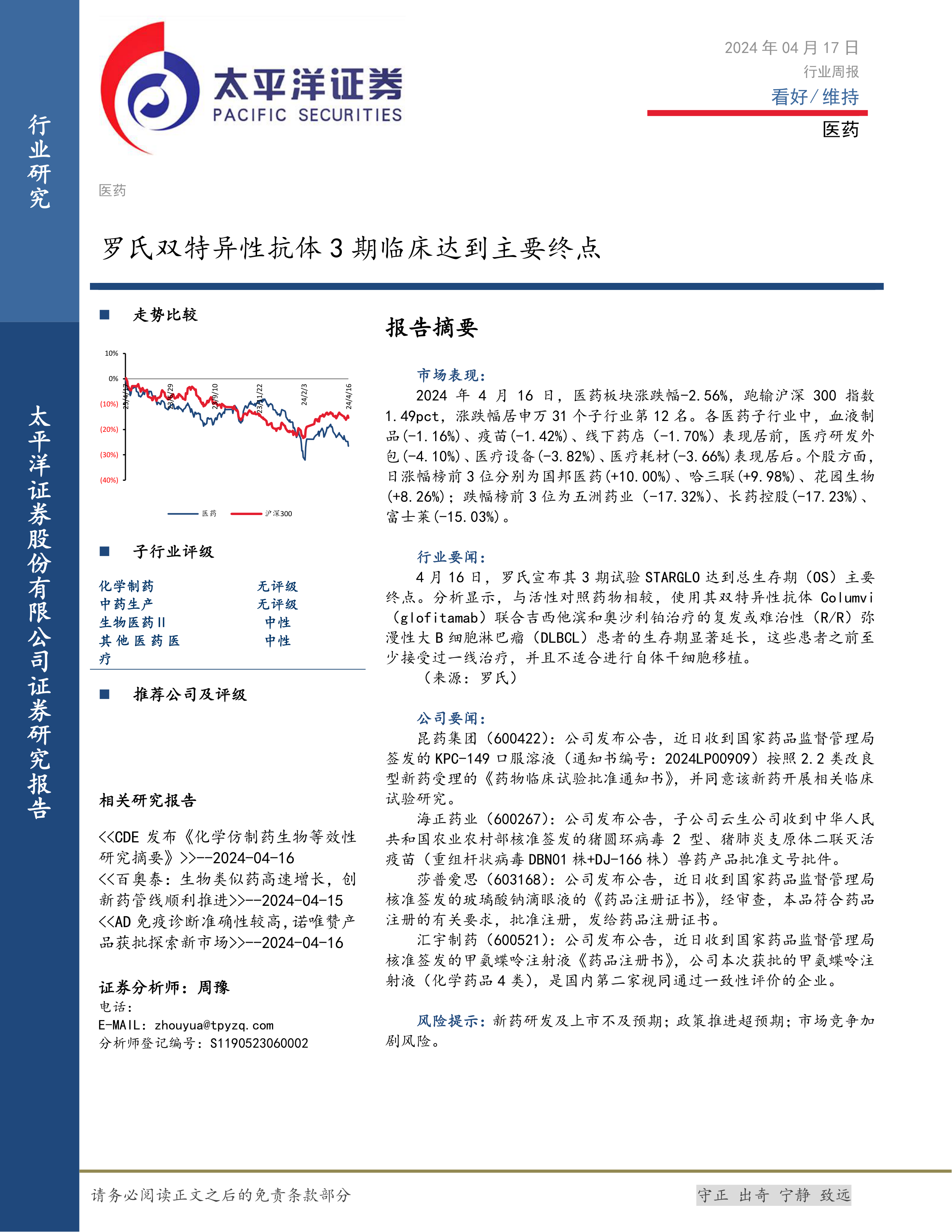 医药行业周报:罗氏双特异性抗体3期临床达到主要终点