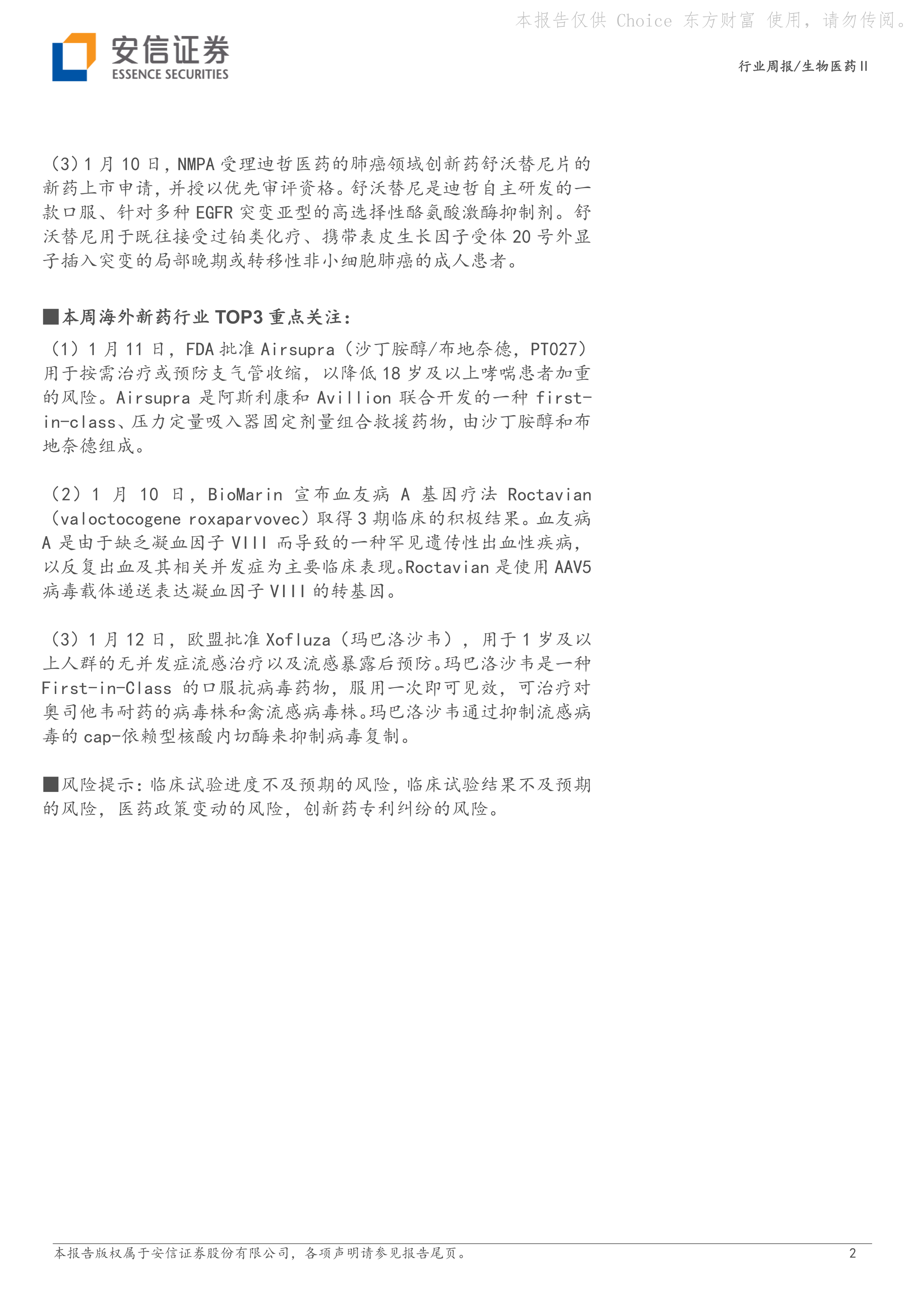 (3)1月12日,欧盟批准Xofluza(玛巴洛沙韦),用于1岁及以上人群的无并发症流感治疗以及流感暴露后预防。玛巴洛沙韦是一种First-in-Class的口服抗病毒药物,服用一次即可见效,可治疗对奥司他韦耐药的病毒株和禽流感病毒株。玛巴洛沙韦通过抑制流感病毒的cap-依赖型核酸内切酶来抑制病毒复制。