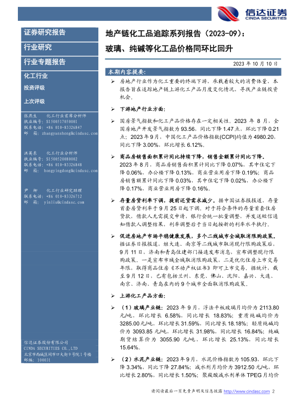 地产链化工品追踪系列报告(2023-09):玻璃、纯碱等化工品价格同环比回升