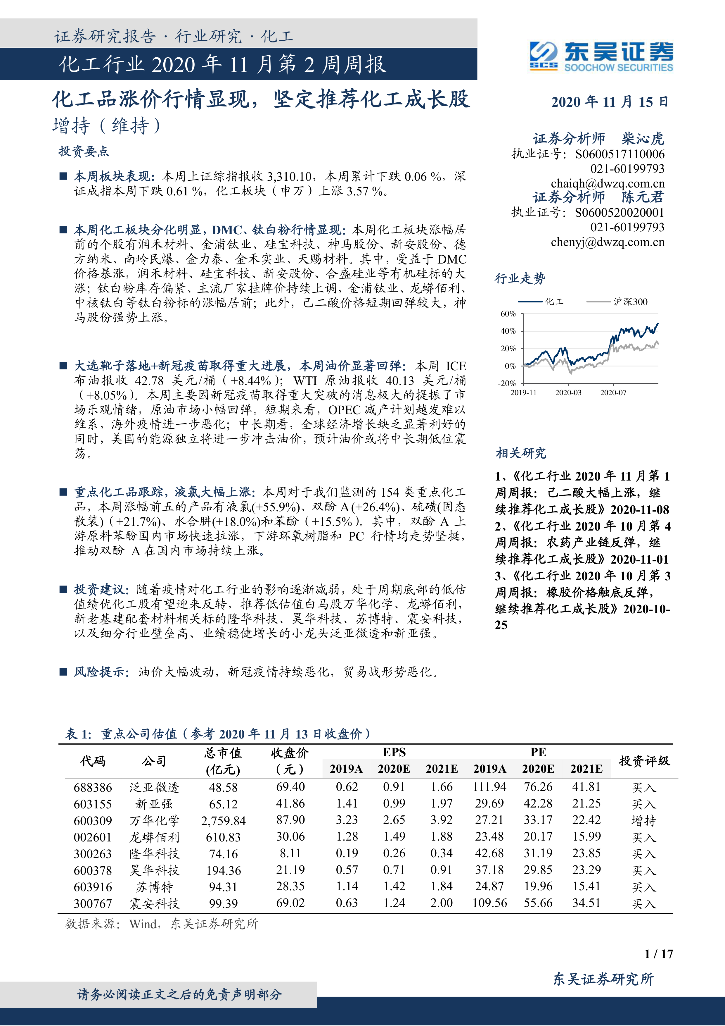 本报告基于对2020年11月第二周化工行业数据的分析,指出化工板块整体表现强劲,部分化工产品价格大幅上涨。 报告认为,这主要受益于新冠疫苗研发进展、油价回弹以及部分产品供需关系的改善。 报告推荐关注低估值白马股和受益于新老基建投资的化工成长股,并提示了潜在的风险因素。 报告提供了详尽的数据和图表,对化工行业投资者具有重要的参考价值。