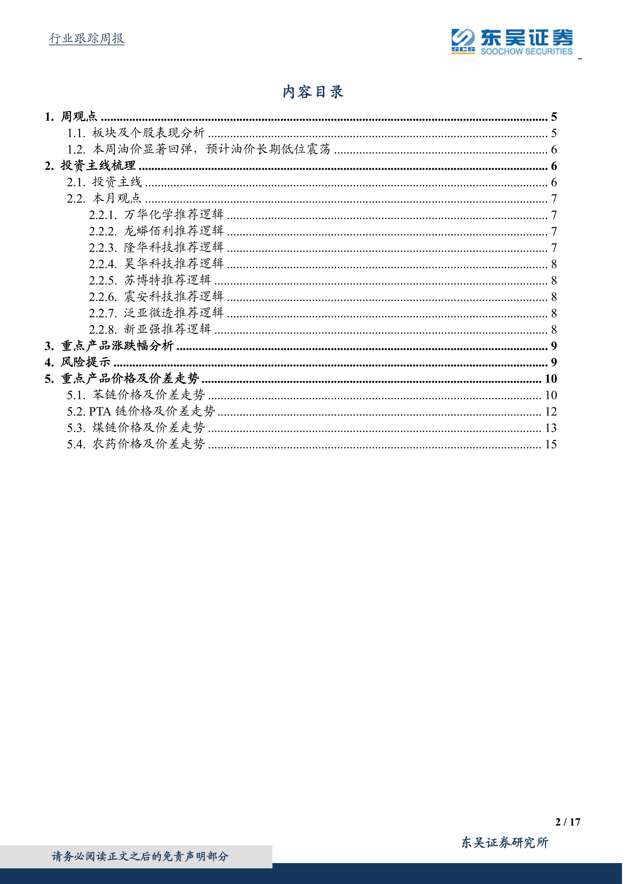 报告跟踪了154类重点化工产品价格,分析了涨跌幅前五的产品,并对部分产品价格上涨或下跌的原因进行了分析。 报告还提供了大量图表,展示了重点化工产品(苯链、PTA链、煤链、农药)的价格及价差走势。