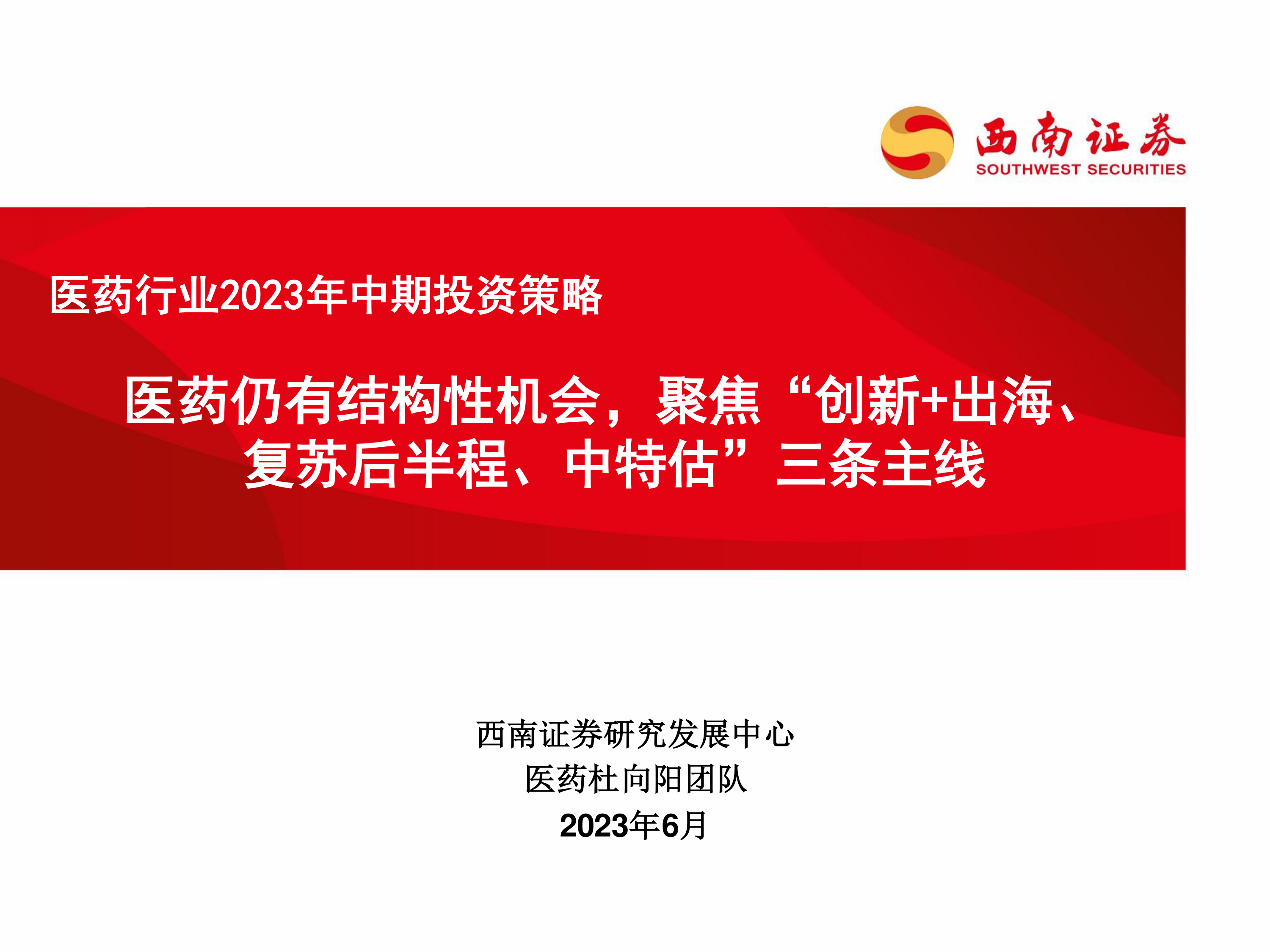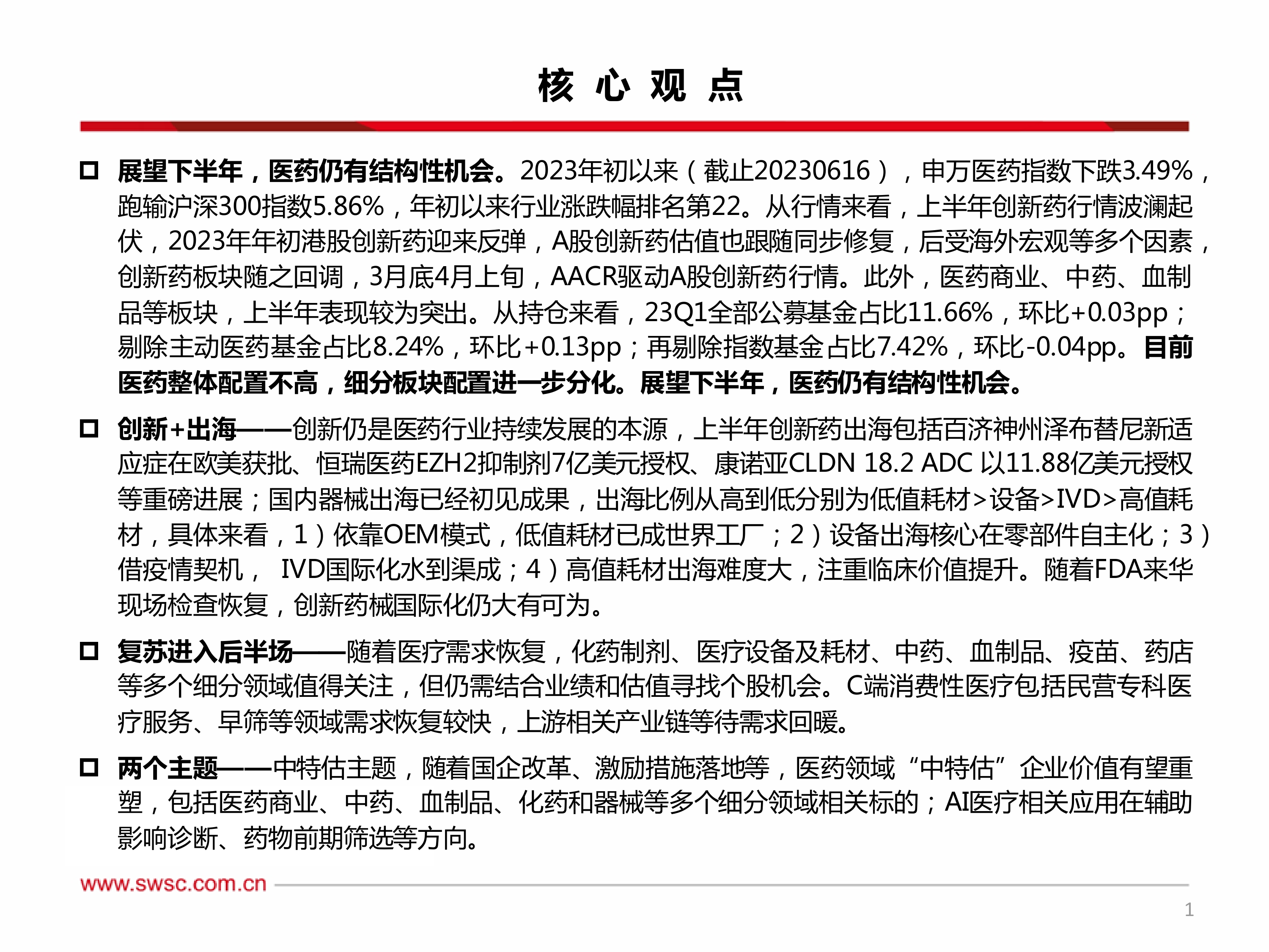 本报告的核心观点是:2023年下半年,医药行业仍存在结构性投资机会,主要集中在“创新+出海”、“复苏后半程”和“中特估”三大主线。报告基于2023年上半年医药行业二级市场表现、政策环境变化以及各细分领域发展现状,对下半年医药行业投资策略进行了深入分析,并推荐了相应的投资组合。
