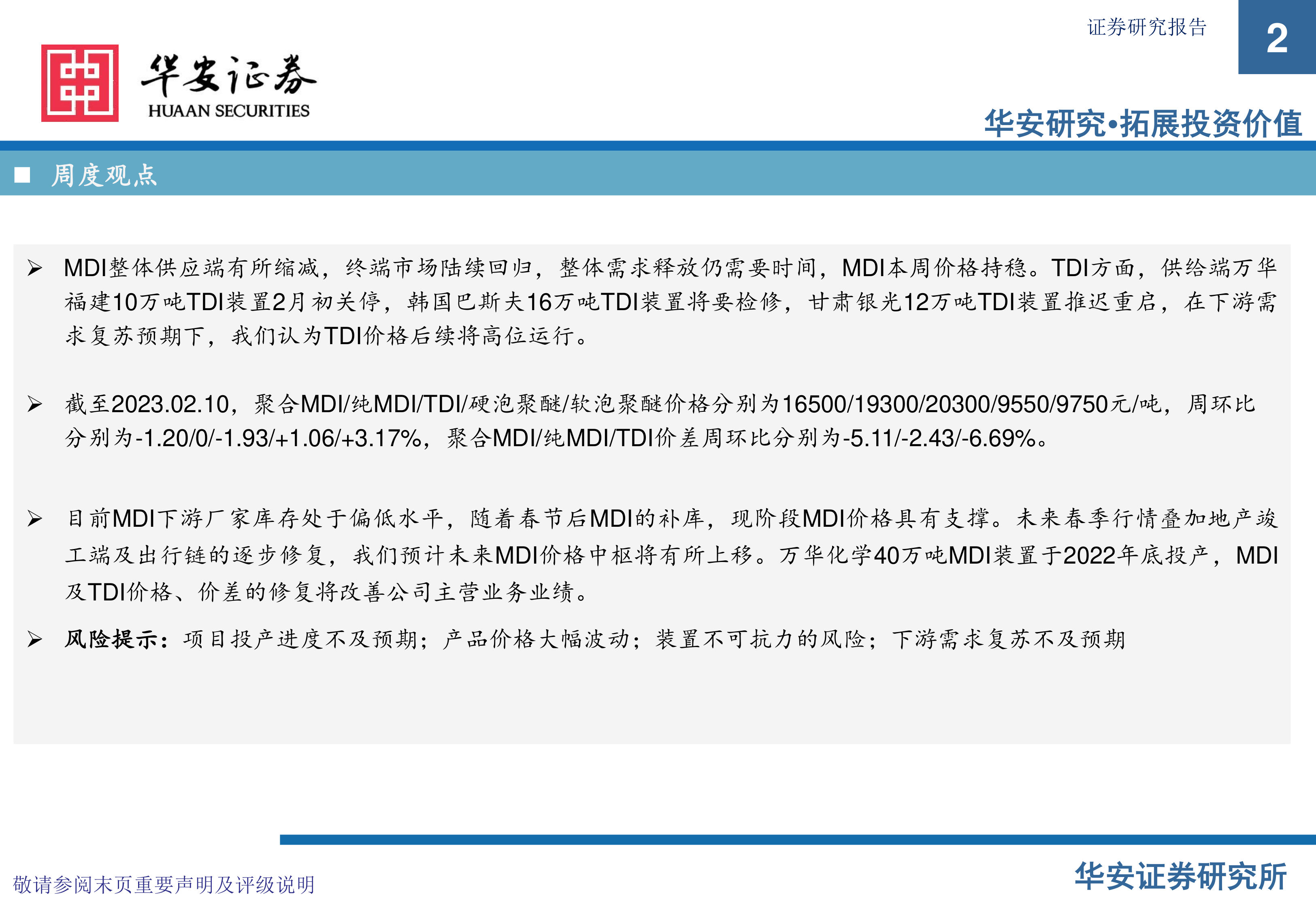 目前MDI下游厂家库存处于偏低水平,春节后补库将对MDI价格形成支撑。未来春季行情叠加地产竣工端及出行链的逐步修复,预计MDI价格中枢将有所上移。万华化学40万吨MDI装置于2022年底投产,MDI及TDI价格和价差的修复将改善公司主营业务业绩。然而,报告也提示了项目投产进度不及预期、产品价格大幅波动、装置不可抗力以及下游需求复苏不及预期等风险。