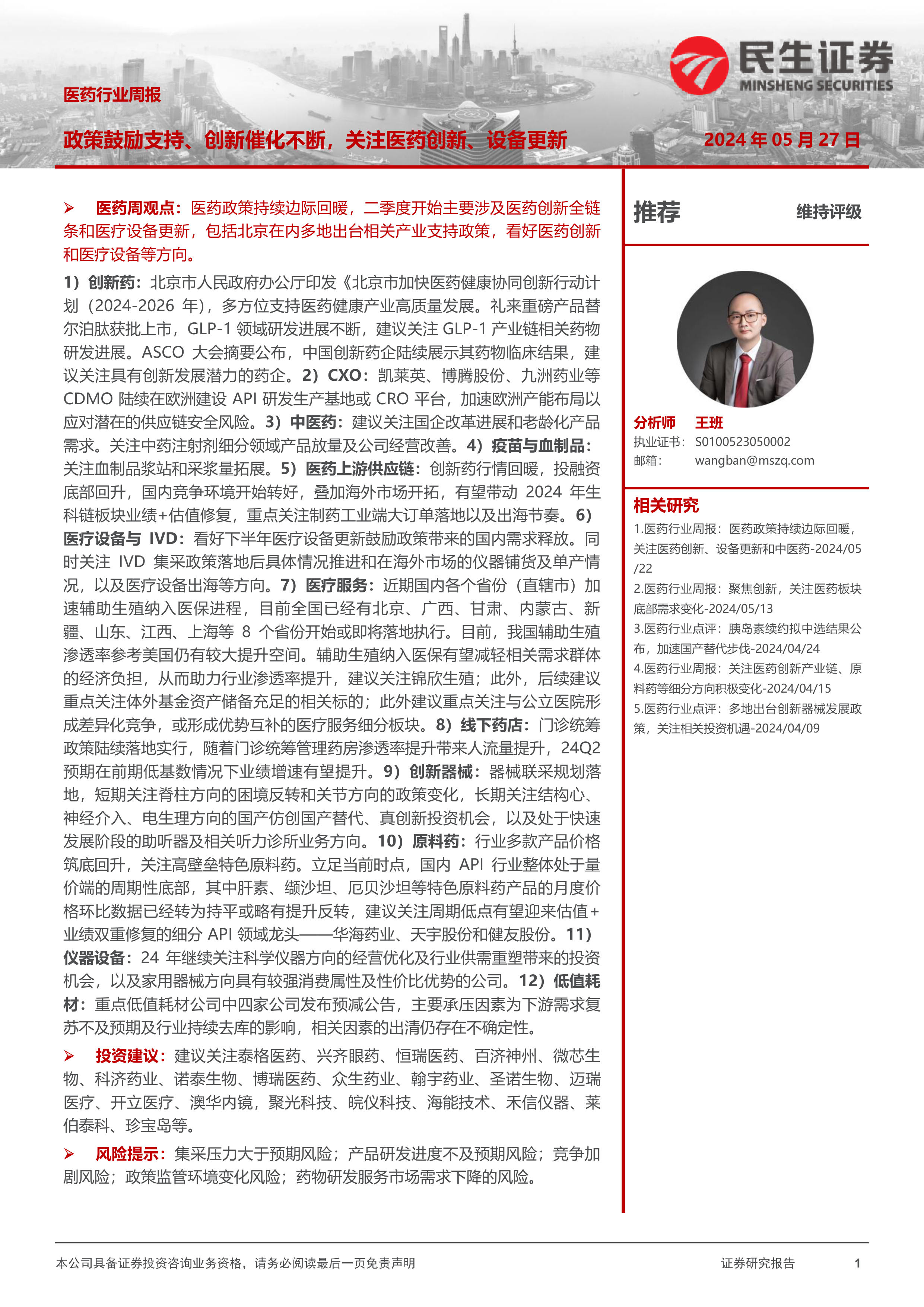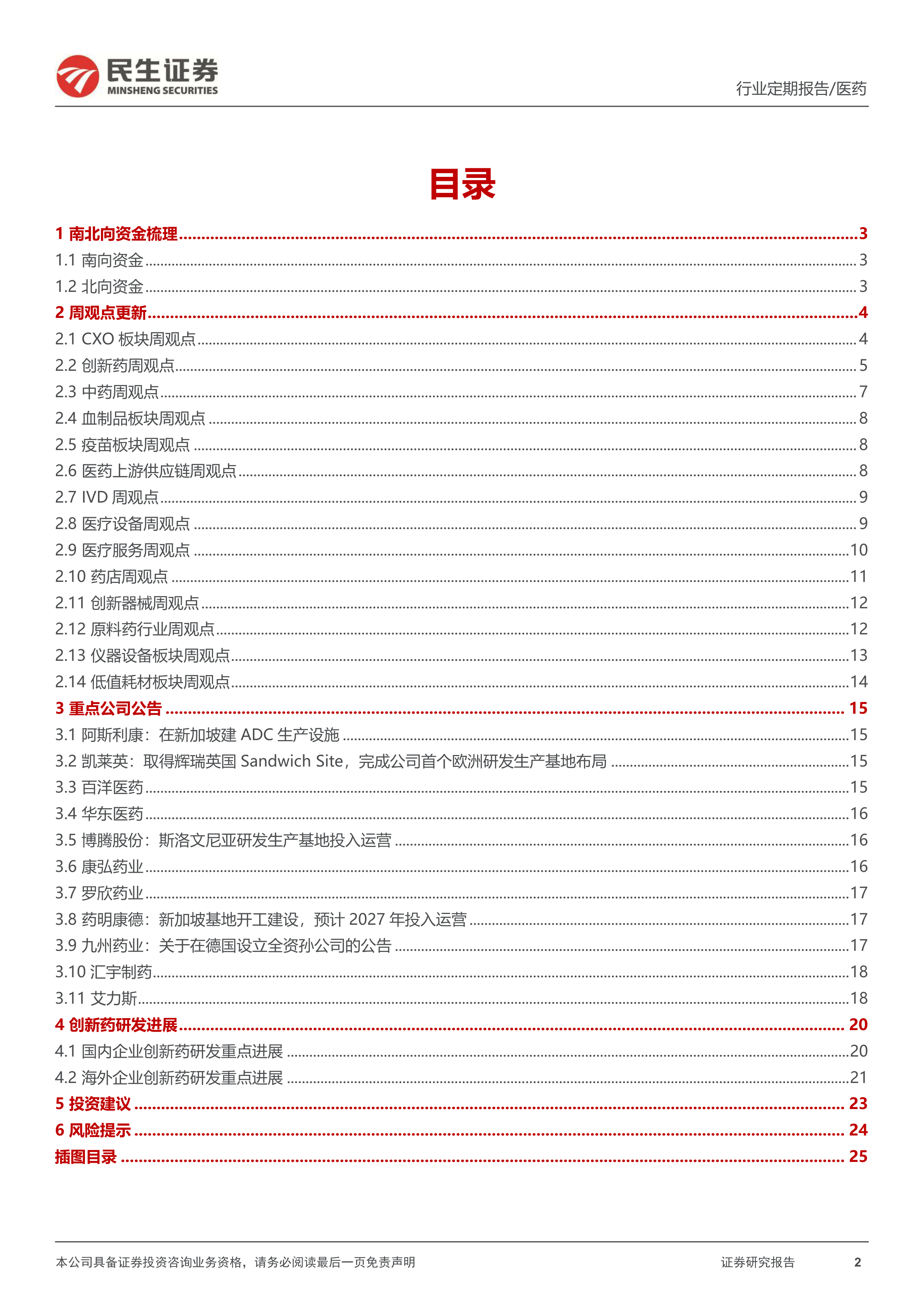 风险提示:集采压力大于预期风险;产品研发进度不及预期风险;竞争加剧风险;政策监管环境变化风险;药物研发服务市场需求下降的风险。