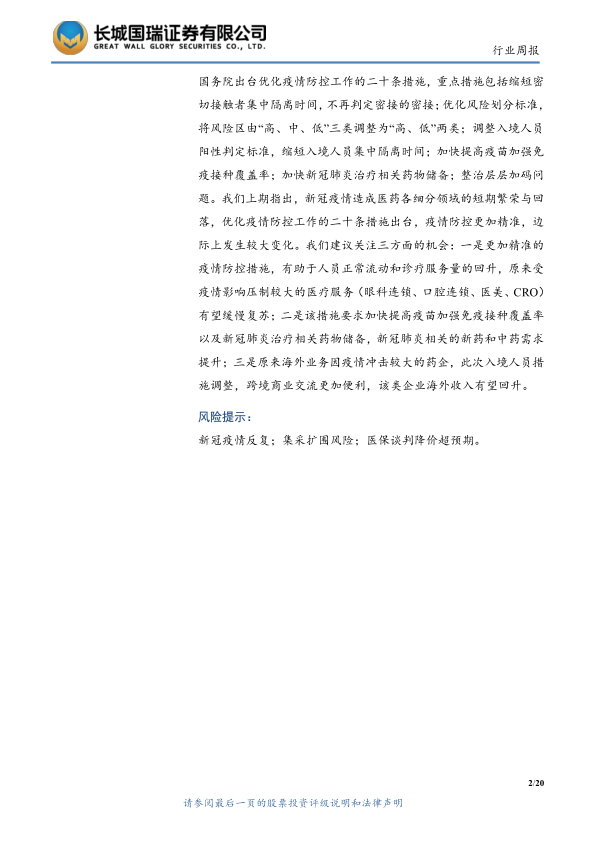 国务院出台优化疫情防控工作的二十条措施,重点措施包括缩短密切接触者集中隔离时间,不再判定密接的密接;优化风险划分标准,将风险区由“高、中、低”三类调整为“高、低”两类;调整入境人员阳性判定标准,缩短入境人员集中隔离时间;加快提高疫苗加强免疫接种覆盖率;加快新冠肺炎治疗相关药物储备;整治层层加码问题。我们上期指出,新冠疫情造成医药各细分领域的短期繁荣与回落,优化疫情防控工作的二十条措施出台,疫情防控更加精准,边际上发生较大变化。我们建议关注三方面的机会:一是更加精准的疫情防控措施,有助于人员正常流动和诊疗服务量的回升,原来受疫情影响压制较大的医疗服务(眼科连锁、口腔连锁、医美、CRO)有望缓慢复苏;二是该措施要求加快提高疫苗加强免疫接种覆盖率以及新冠肺炎治疗相关药物储备,新冠肺炎相关的新药和中药需求提升;三是原来海外业务因疫情冲击较大的药企,此次入境人员措施调整,跨境商业交流更加便利,该类企业海外收入有望回升。风 险提示: