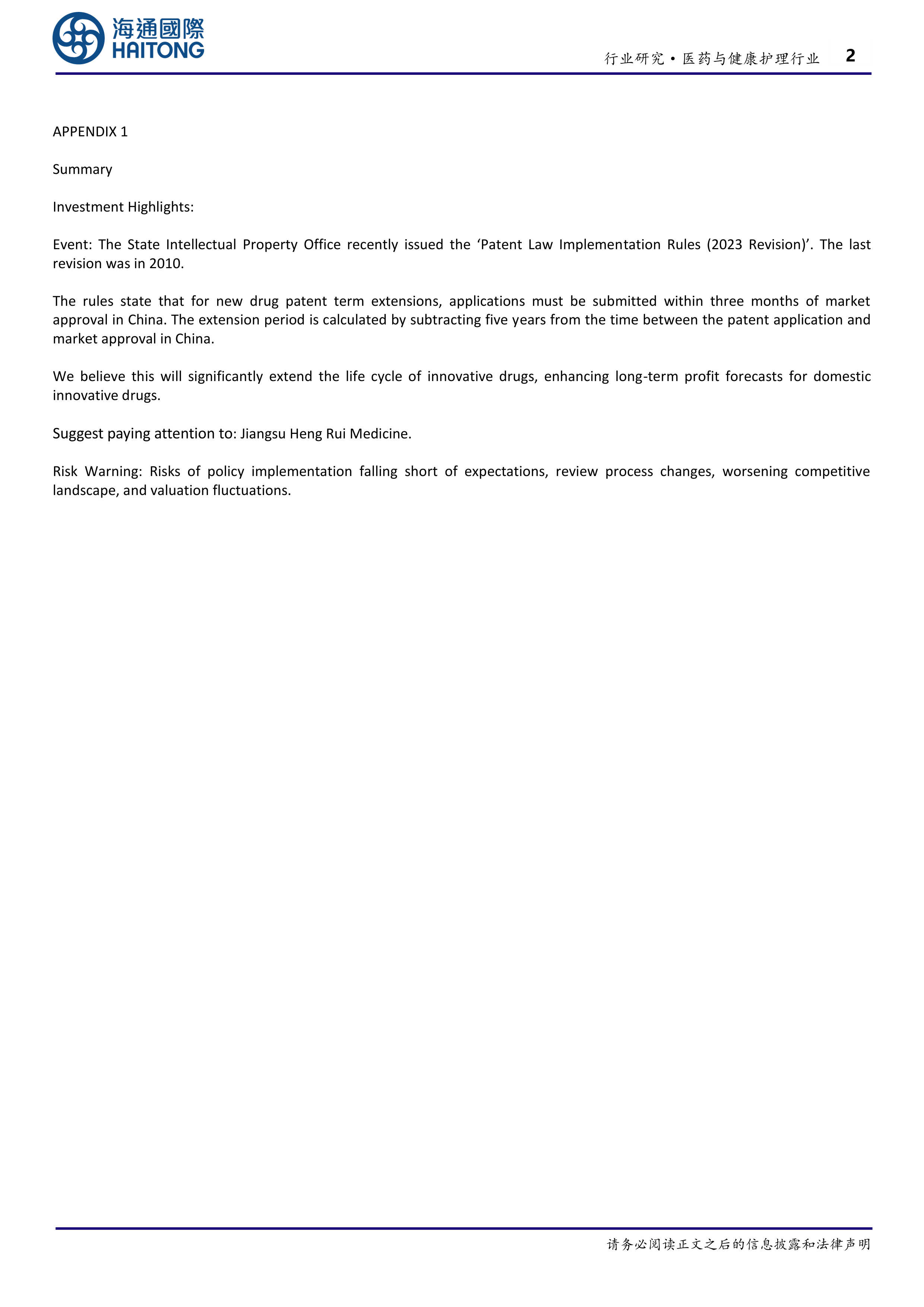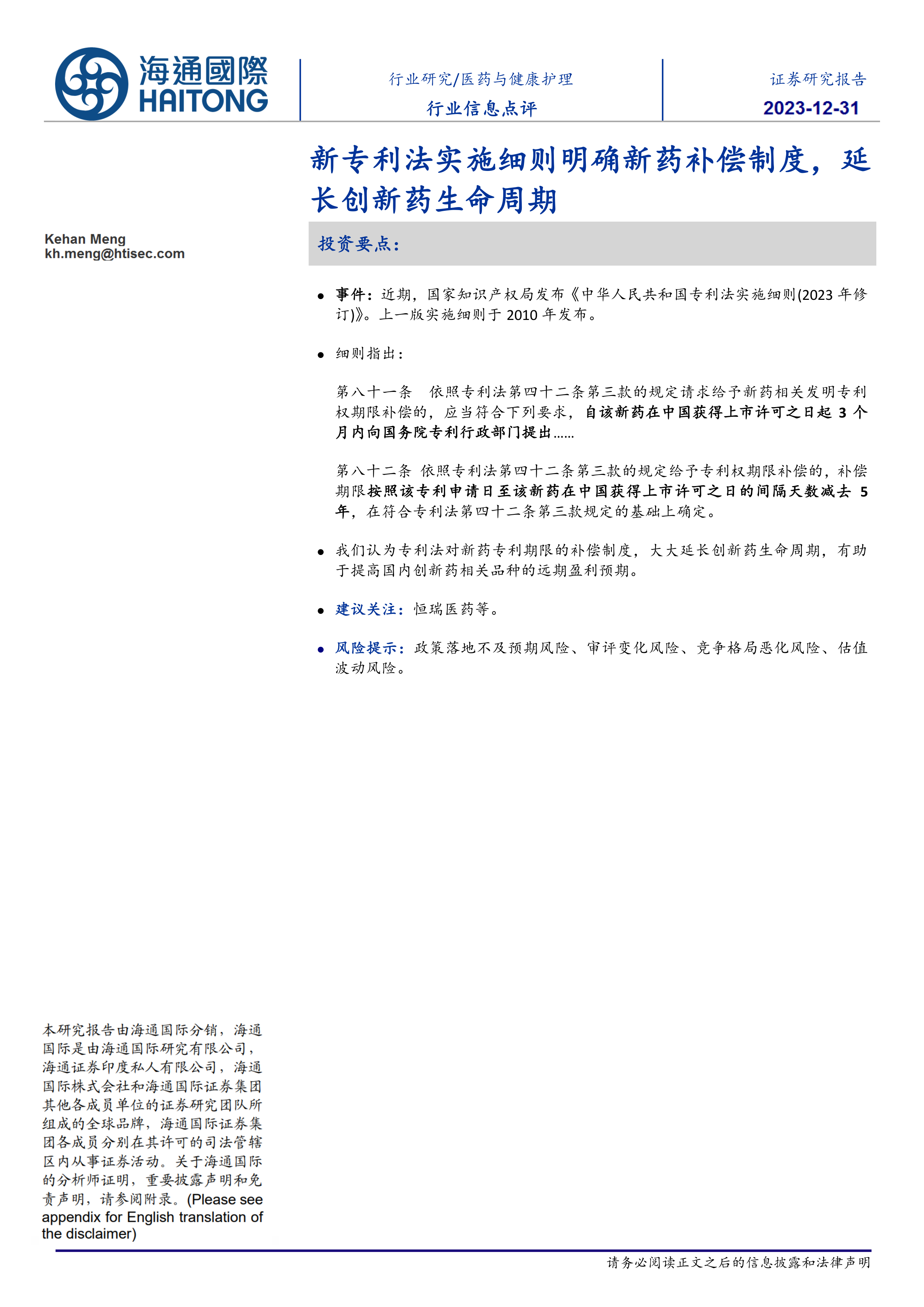 本报告的核心观点是:2023年修订的《中华人民共和国专利法实施细则》中明确的新药专利期限补偿制度,将显著延长创新药的生命周期,提升国内创新药的长期盈利预期。该政策对医药行业,特别是创新药企业具有积极影响,值得关注。
