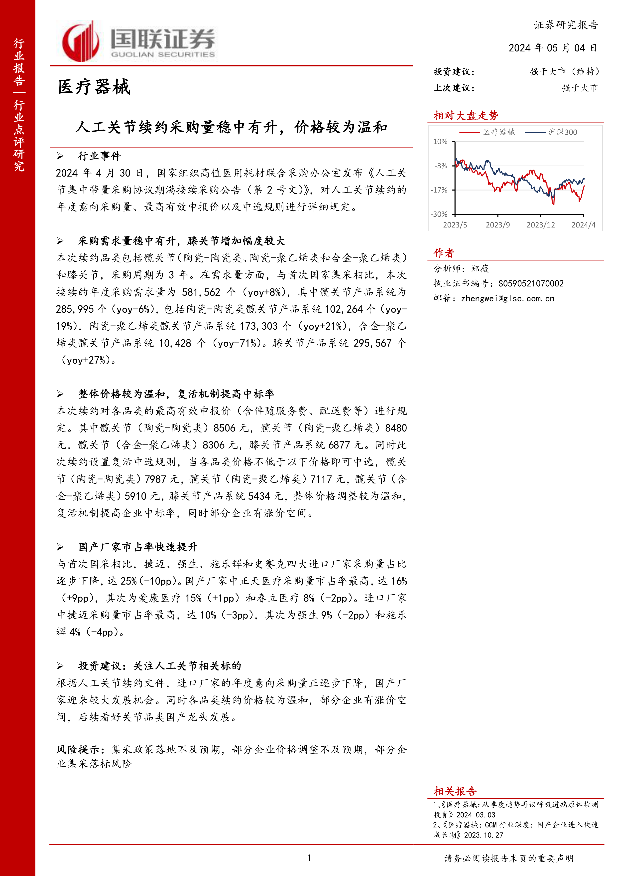 报告维持“强于大市”的投资建议,并建议关注人工关节相关标的。报告认为,进口厂商的采购量持续下降,国产厂商迎来发展机遇。