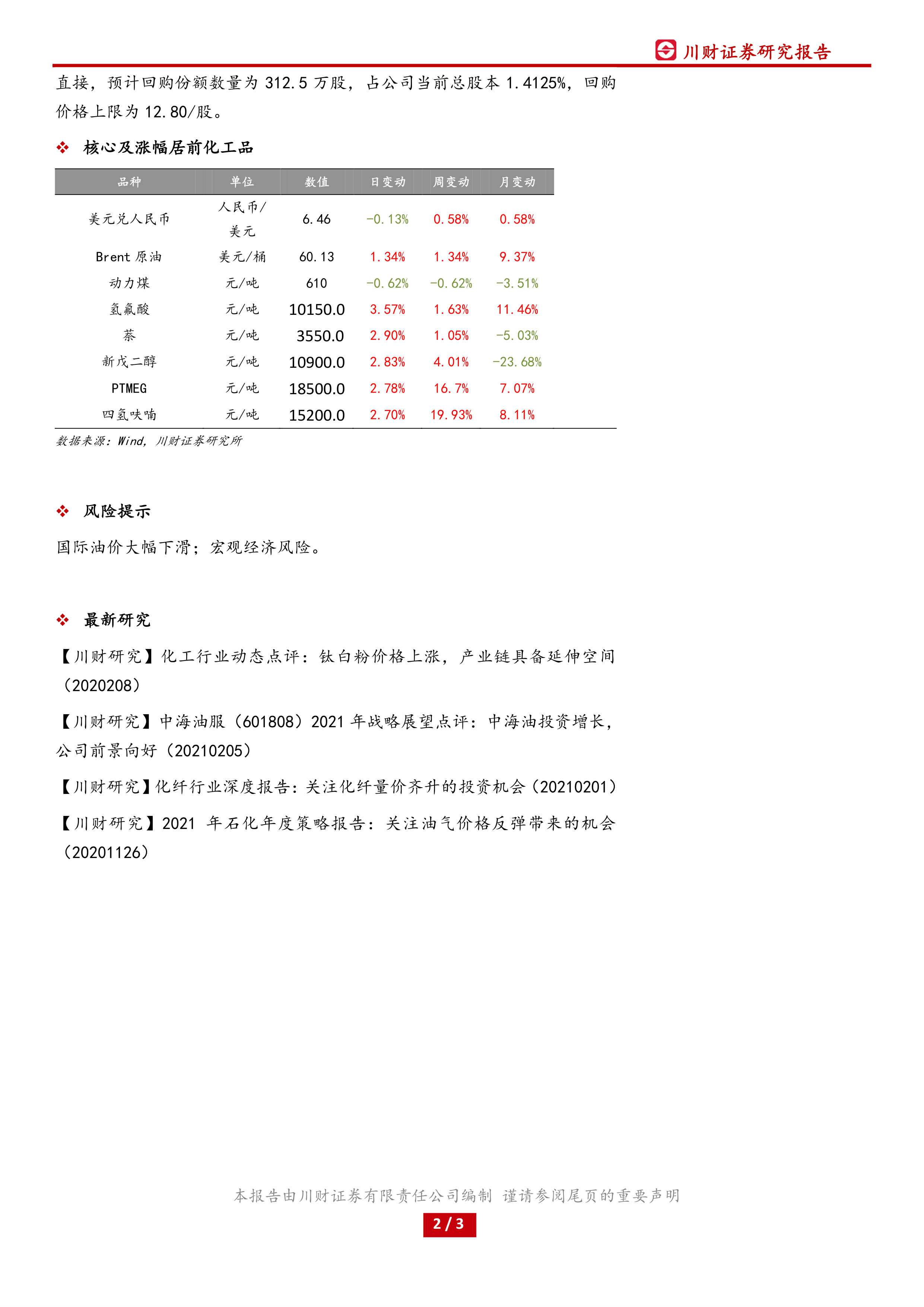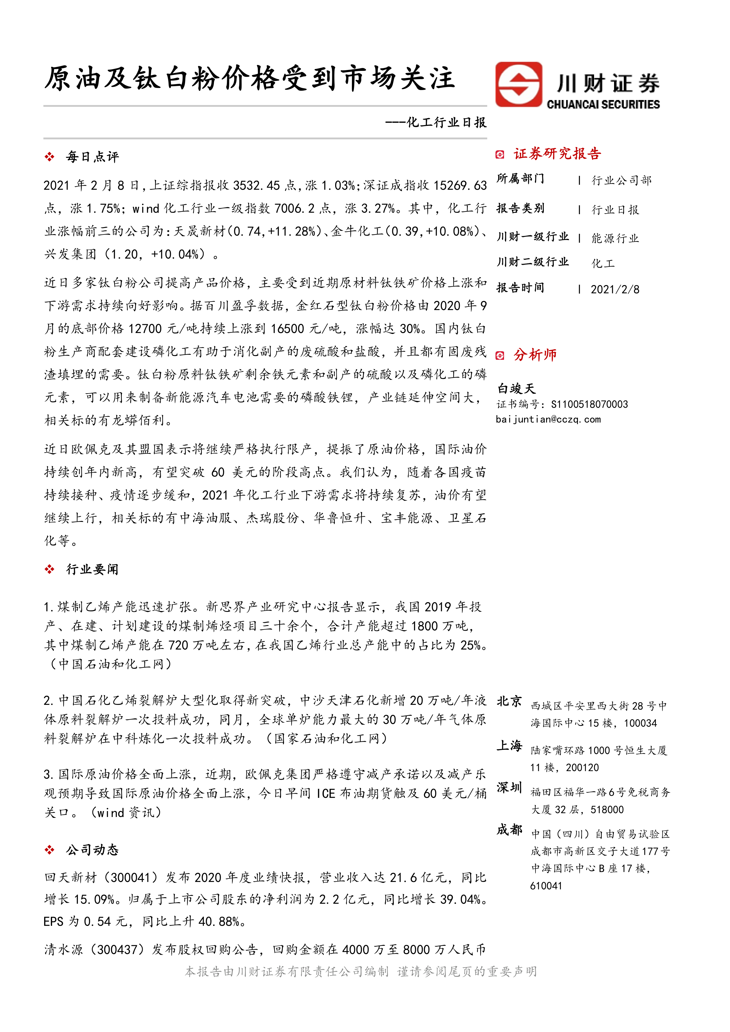 本报告的核心观点是:2021年2月8日,化工行业整体表现强劲,涨幅达3.27%。原油和钛白粉价格上涨是推动行业增长的主要因素。原油价格上涨受益于欧佩克限产政策和疫情逐步缓和带来的下游需求复苏;钛白粉价格上涨则源于钛铁矿价格上涨和下游需求持续向好。此外,煤制乙烯产能扩张和大型化乙烯裂解炉的投产也预示着化工行业未来发展潜力巨大。 报告同时指出,化工行业产业链延伸空间大,例如钛白粉生产副产品可用于新能源汽车电池生产,具有良好的投资机会。但报告也提示了国际油价大幅下滑和宏观经济风险等潜在风险。