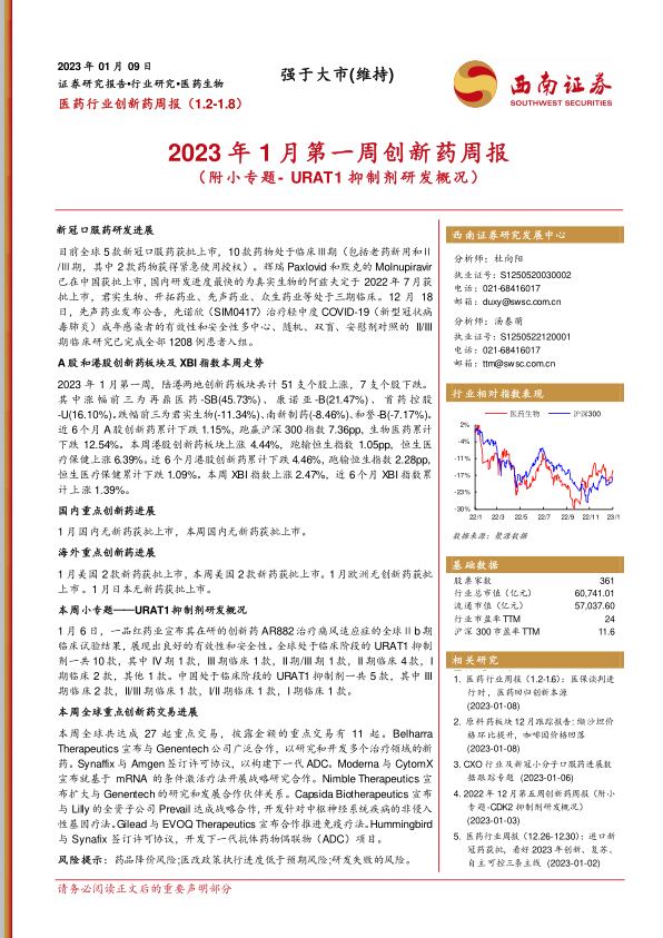 本报告的核心观点是:2023年1月第一周,A股和港股创新药板块表现分化,A股跑赢沪深300指数,港股跑输恒生指数;全球创新药市场方面,美国获批新药数量较多,国内暂无新药获批上市;新冠口服药研发方面,国内阿兹夫定和先诺欣进展领先,海外Paxlovid和Molnupiravir已在中国获批上市;URAT1抑制剂研发方面,全球多个项目处于临床阶段,其中一品红药业的AR882展现良好疗效。