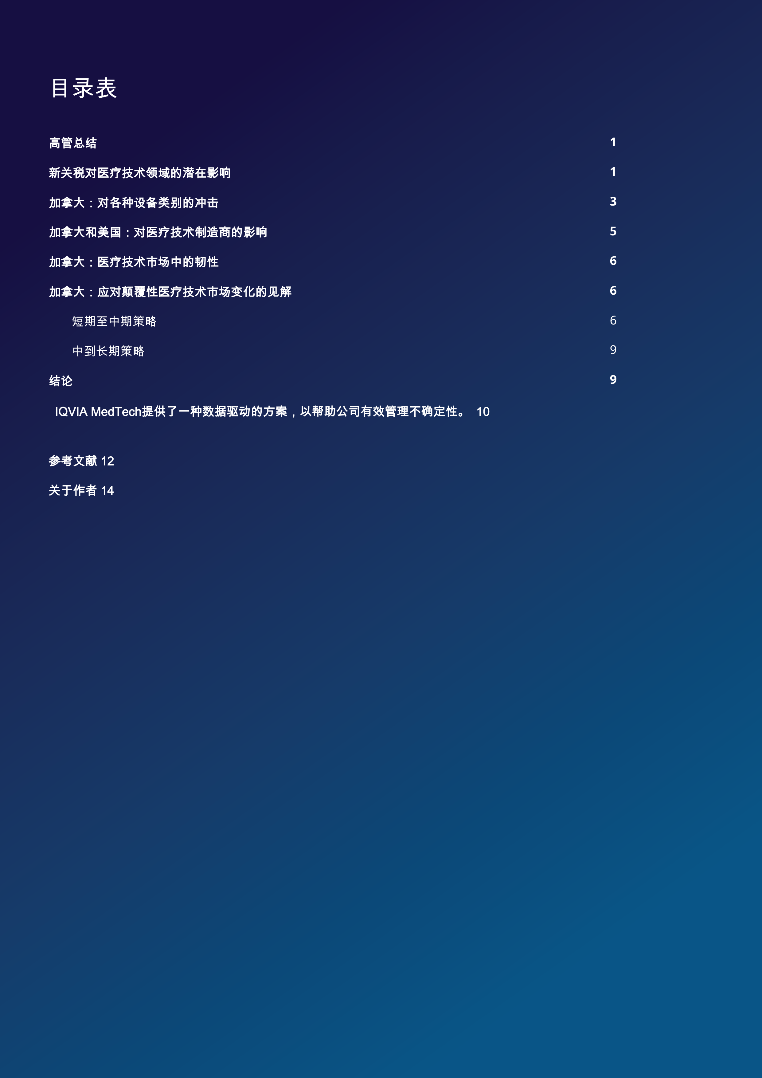 这份白皮书深入分析了美国新关税对加拿大医疗技术市场的影响,并提出了全面的应对策略。白皮书强调了供应链多元化、本地化生产、战略合作和数字化转型的重要性,并建议医疗技术公司积极收集市场情报,调整财务和定价策略,确保监管合规性,以应对不断变化的全球市场环境。IQVIA MedTech提供的基于数据的解决方案,为企业有效管理不确定性提供了有力支持。 白皮书的研究结果对其他地区的医疗技术公司也具有参考价值。