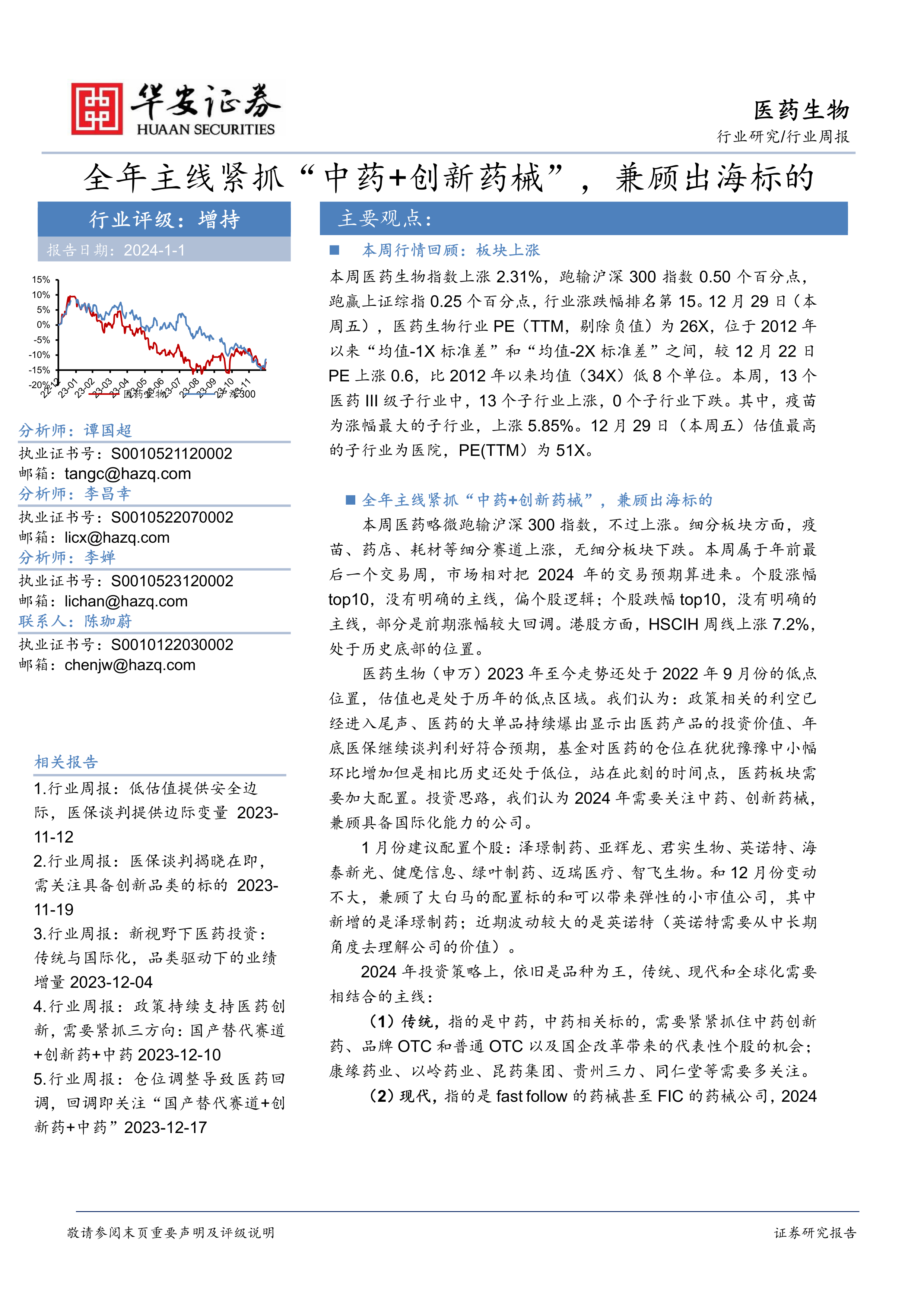 本报告对2024年医药生物行业投资进行了展望,认为“中药+创新药械+国际化”将成为主要投资主线。本周医药生物板块整体表现向好,但估值仍处于历史低位,具备配置价值。报告详细分析了市场行情、个股表现,并推荐了多个值得关注的细分领域和个股,为投资者提供了有价值的参考信息。 需要注意的是,投资存在风险,投资者应根据自身风险承受能力进行投资决策。